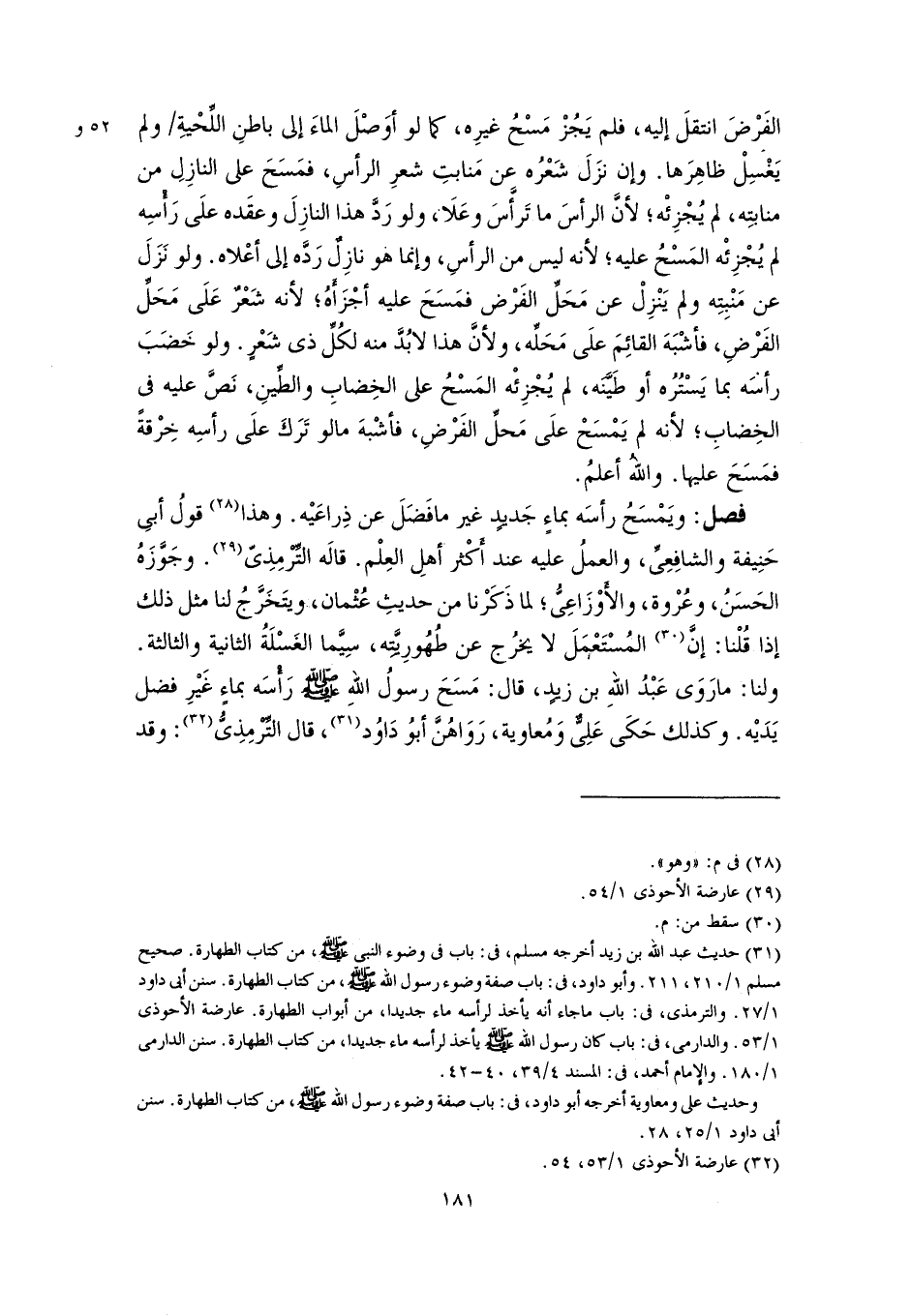 (٣١) حديث عبد اللَّه بن زيد أخرجه مسلم، في: باب في وضوء النبي -صلى اللَّه عليه وسلم-، من كتاب الطهارة. صحيح مسلم ١/ ٢١٠، ٢١١. وأبو داود، في: باب صفة وضوء رسول اللَّه -صلى اللَّه عليه وسلم-، من كتاب الطهارة. سنن أبي داود ١/ ٢٧. والترمذي، في: باب ما جاء أنه يأخذ لرأسه ماء جديدا، من أبواب الطهارة. عارضة الأحوذى ١/ ٥٣. والدارمى، في: باب كان رسول اللَّه -صلى اللَّه عليه وسلم- يأخذ لرأسه ماء جديدا، من كتاب الطهارة. سنن الدارمي ١/ ١٨٠. والإمام أحمد، في: المسند ٤/ ٣٩، ٤٠ - ٤٢.
