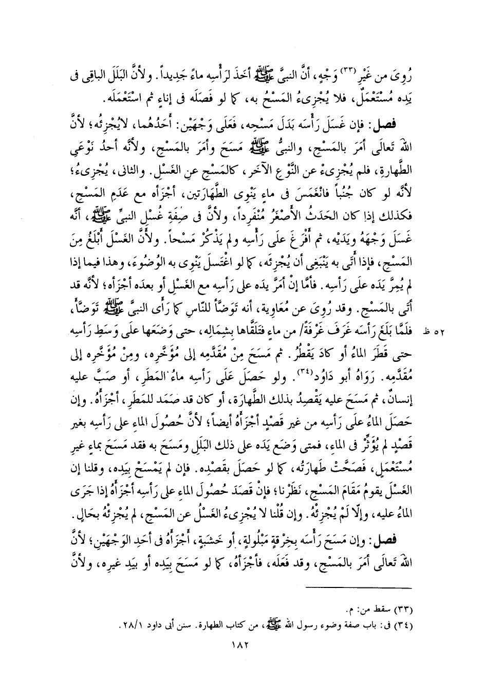 فصل: فإن غَسَلَ رَأْسَه بَدَلَ مَسْحِه، فَعَلَى وَجْهَيْن: أَحَدُهُما، لا يُجْزِئُه؛ لأنَّ اللهَ تَعالَى أمَرَ بالمَسْحِ، والنبىُّ -صلى اللَّه عليه وسلم- مَسَحَ وأمَرَ بالمَسْحِ، ولأنَّه أحدُ نَوْعَىِ الطَّهارةِ، فلم يُجْزِىءْ عن النَّوْعِ الآخَر، كالمَسْحِ عنِ الغَسْلِ. والثانى، يُجْزِىءُ؛ لأنَّه لو كان جُنُبًا فانْغَمَسَ في ماءٍ يَنْوِى الطَّهَارَتين، أجْزَأه مع عَدَمِ المَسْحِ، فكذلك إذا كان الحَدَثُ الأَصْغَرُ مُنْفَرِدًا، ولأنَّ في صِفَةِ غُسْلِ النبيِّ -صلى اللَّه عليه وسلم-، أنَّه غَسَلَ وَجْهَهُ ويَدَيْه، ثم أَفْرَغَ علَى رَأْسِه ولم يَذْكُرْ مَسْحًا. ولأَنَّ الغَسْلَ أَبْلَغُ مِنَ المَسْحِ، فإذا أَتَى به يَنْبَغِى أن يُجْزِئَه، كما لو اغْتَسلَ يَنْوِى به الوُضُوءَ، وهذا فيما إذا لم يُمِرَّ يَدَه علَى رَأسِه. فأمَّا إنْ أمَرَّ يدَه على رَأسِه مع الغَسْلِ أو بعدَه أجْزَأه؛ لأنَّه قد أتَى بالمَسْحِ. وقد رُوىَ عن مُعَاوِية، أنه تَوَضَّأ للنّاسِ كما رَأَى النبيَّ -صلى اللَّه عليه وسلم- تَوَضَّأَ، فلَمَّا بَلَغ رَأسَه غَرَفَ غَرْفَةً من ماءٍ فتَلَقَّاها بِشِمَالِه، حتى وَضَعَها علَى وَسَطِ رَأسِه حتى قَطَرَ الماءُ أو كادَ يَقْطُرُ. ثم مَسَحَ مِنْ مُقَدَّمِه إلى مُؤَخَّرِه، ومِنْ مُؤَخَّرِه إلى مُقَدَّمِه. رَوَاهُ أبو دَاوُد (٣٤). ولو حَصَلَ عَلَى رَأسِه ماءُ المَطَرِ، أو صَبَّ عليه إنسانٌ، ثم مَسَحَ عليه يَقْصِدُ بذلك الطَّهارَة، أو كان قد صَمَد للمَطَرِ، أجْزَأَهُ. وإن حَصَلَ الماءُ علَى رَأسِه من غير قَصْدٍ أجْزَأَهُ أيضًا؛ لأنَّ حُصُولَ الماءِ على رَأسِه بغير قَصْدٍ لم يُؤَثِّرْ في الماءِ، فمتى وَضَع يَدَه على ذلك البَلَلِ ومَسَحَ به فقد مَسَحَ بماءٍ غيرِ مُسْتَعْمَلٍ، فَصَحَّتْ طَهارَتُه، كما لو حَصَلَ بقَصْدِه. فإن لم يَمْسَحْ بِيَدِه، وقلنا إن الغَسْلَ يقومُ مَقَامَ المَسْحِ، نَظَرْنا؛ فإنْ قَصَدَ حُصُولَ الماءِ على رَأسِه أجْزَأَهُ إذا جَرَى الماءُ عليه، وإلّا لَمْ يُجْزِئْهُ. وإن قُلْنا لا يُجْزِىءُ الغَسْلُ عن المَسْحِ، لم يُجْزِئْهُ بحَالٍ.