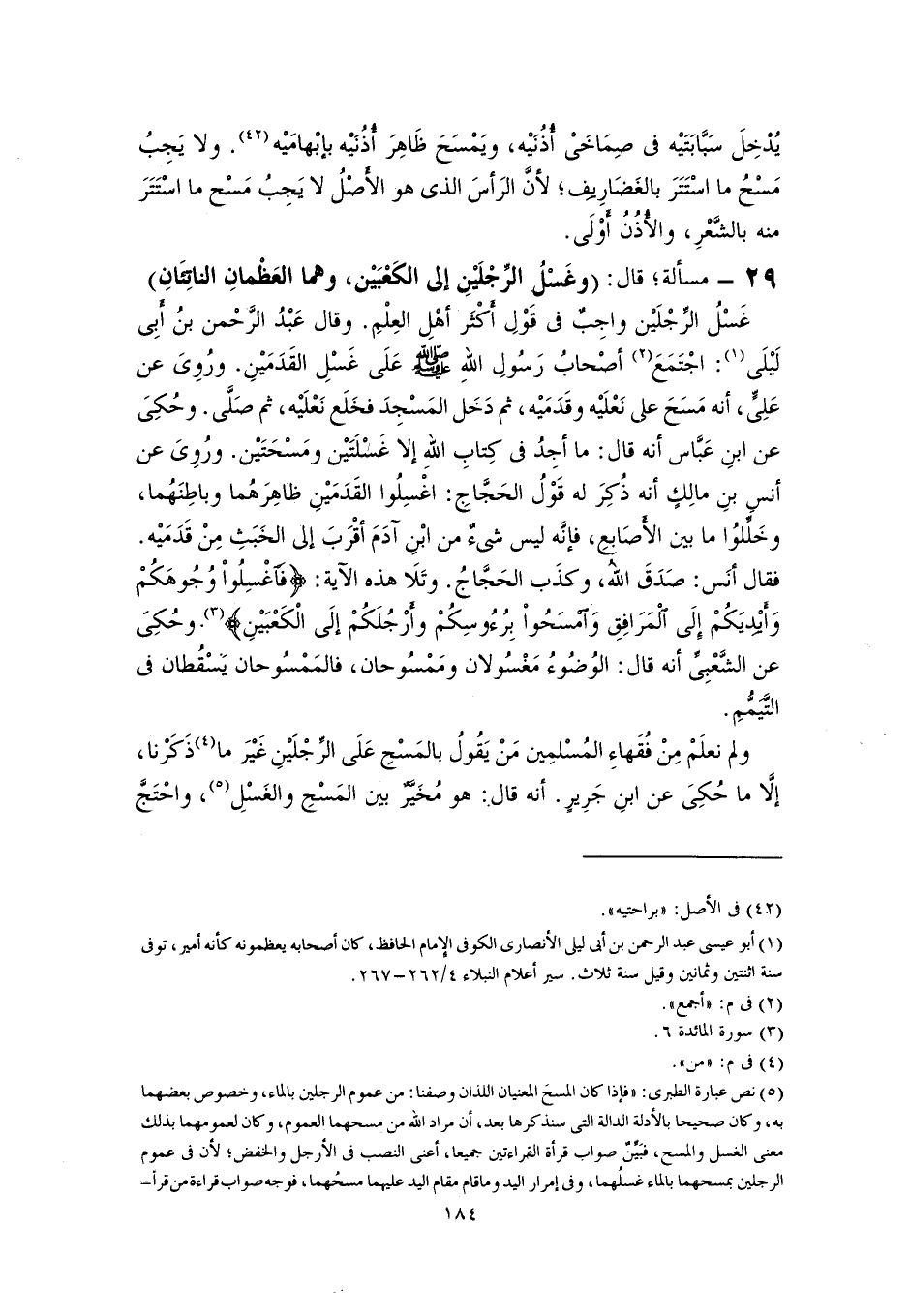 (٥) نص عبارة الطبري: "فإذا كان المسح المعنيان اللذان وصفنا: من عموم الرجلين بالماء، وخصوص بعضهما به، وكان صحيحا بالأدلة الدالة التي سنذكرها بعد، أن مراد اللَّه من مسحهما العموم، وكان لعمومهما بذلك معنى الغسل والمسح، فبَيِّنٌ صواب قرأة القراءتين جميعا، أعنى النصب في الأرجل والخفض؛ لأن في عموم الرجلين بمسحهما بالماء غسلُهما، وفى إمرار اليد وما قام مقام اليد عليهما مسحُهما، فوجه صواب قراءة من قرأ =