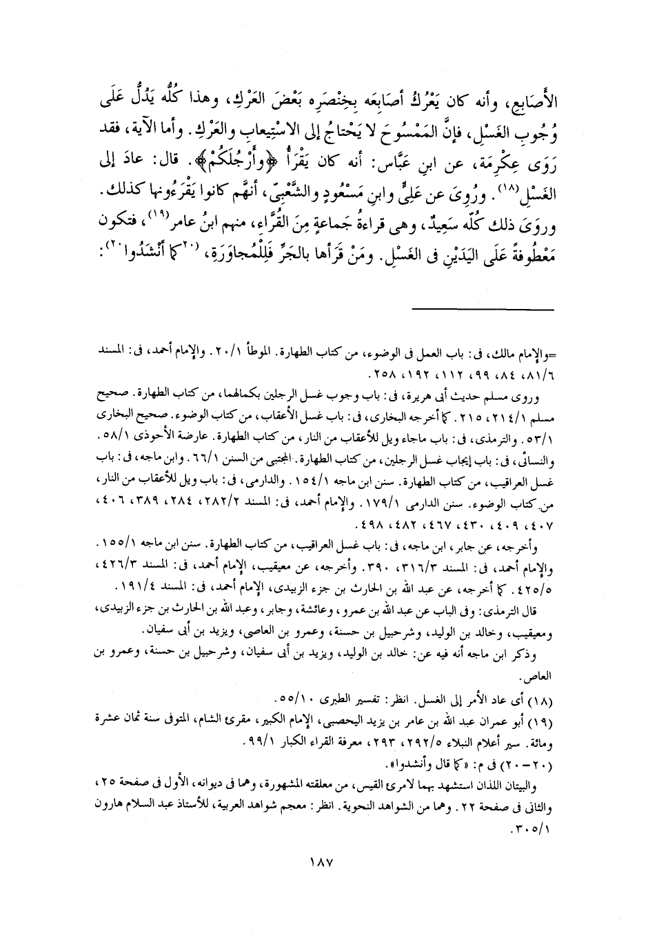 الأَصَابِعِ، وأنه كان يَعْرُكُ أصَابِعَه بِخِنْصَرِه بَعْضَ العَرْكِ، وهذا كُلُّه يَدُلُّ عَلَى وُجُوبِ الغَسْلِ، فإنَّ المَمْسُوحَ لا يَحْتاجُ إلى الاسْتِيعابِ والعَرْكِ. وأما الآية، فقد رَوَى عِكْرِمَة، عن ابنِ عَبَّاس: أنه كان يَقْرَأْ {وَأَرْجُلَكُمْ}. قال: عادَ إلى الغَسْلِ (١٨). ورُوِىَ عن عَلِىٍّ وابنِ مَسْعُودٍ والشَّعْبِىّ، أنهَّم كانوا يَقْرَءُونها كذلك. وروَىَ ذلك كُلّه سَعِيدٌ، وهي قراءةُ جَماعةٍ مِنَ القُرَّاءِ، منهم ابنُ عامر (١٩)، فتكون مَعْطُوفةً عَلَى اليَدَيْنِ في الغَسْلِ. ومَنْ قَرَأها بالجَرِّ فَلِلْمُجاوَرَةِ، [كما أَنْشَدُوا] (٢٠):