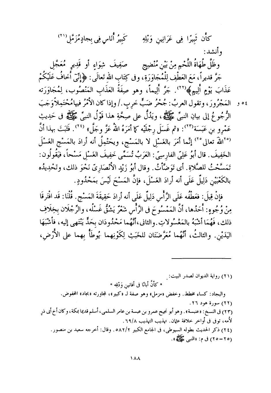 جَرَّ قديرًا، مَعَ العَطْفِ لِلْمُجَاوَرَةِ، وفى كِتَابِ اللهِ تَعالَى: {إِنِّي أَخَافُ عَلَيْكُمْ عَذَابَ يَوْمٍ أَلِيمٍ} (٢٢). جَرَّ أَلِيمًا، وهو صِفَةُ العَذَابِ المَنصُوب، لِمُجَاوَرَته المَجْرُورَ، وتقول العربُ: جُحْرُ ضَبٍّ خَرِبٍ. وإذا كان الأمْرُ فيها مُحْتَمِلًا وَجَبَ الرُّجُوعُ إلى بيانِ النبيِّ -صلى اللَّه عليه وسلم-، ويَدُلُّ على صِحَّةِ هذا قَوْلُ النبيِّ -صلى اللَّه عليه وسلم- في حَدِيثِ عَمْرِو بنِ عَبَسَة (٢٣): "ثم غَسَلَ رِجْلَيْه كما أمَرَهُ اللَّه عَزَّ وجَلَّ" (٢٤). فَثَبَتَ بهذا أنَّ [اللهَ تعالى] (٢٥) إنَّما أمَرَ بالغَسْلِ لا بالمَسْحِ، ويحَتْمِلُ أنه أرادَ بالمَسْحِ الغَسْلَ الخَفِيفَ. قال أبُو عَلِىّ الفارِسِىّ: العَرَبُ تُسَمِّى خَفِيفَ الغَسْلِ مَسْحًا، فيَقُولُون: تَمَسَّحْتُ للصَّلاةِ. أي تَوَضَّأتُ. وقال أبُو زَيْدٍ الأنْصَارِىّ نَحْوَ ذلك، وتَحْدِيدُه بالكَعْبَيْنِ دَلِيلٌ عَلَى أنه أرادَ الغَسْلَ، فإنَّ المَسْحَ لَيْسَ بمَحْدُودٍ.