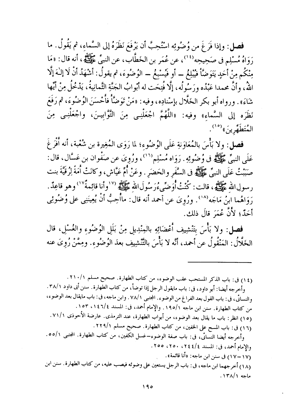فصل: وإذا فَرَغَ من وُضُوئِه اسْتُحِبَّ أن يَرْفَعَ نَظَرَهُ إلى السَّماءِ، ثم يَقُولُ. ما رَوَاهُ مُسْلِم في صَحِيحِه (١٤)، عن عُمَر بن الخَطَّاب، عن النبيِّ -صلى اللَّه عليه وسلم-، أنه قال: "مَا مِنْكُم مِنْ أحَدٍ يَتَوَضَّأ فيُبْلِغُ - أو فَيُسْبِغُ - الوُضُوءَ، ثم يقولُ: أشْهَدُ أنْ لَا إلهَ إلَّا اللهُ، وأنَّ محمدا عَبْدُه ورَسُولُه، إلَّا فُتِحَت له أَبْوابُ الجَنَّةِ الثَّمانِيةُ، يَدْخُلُ مِنْ أيِّها شَاءَ". ورواه أبو بكر الخَلَّال بإسْنادِه، وفيه: "مَنْ تَوَضَّأَ فأَحْسَنَ الوُضُوءَ، ثم رَفَعَ نَظَرَه إلى السَّماءِ" وفيه: "اللَّهُمَّ اجْعَلْنِى مِنَ التَّوَّابِينَ، واجْعَلْنِى مِنَ المُتَطَهِّرِينَ" (١٥).