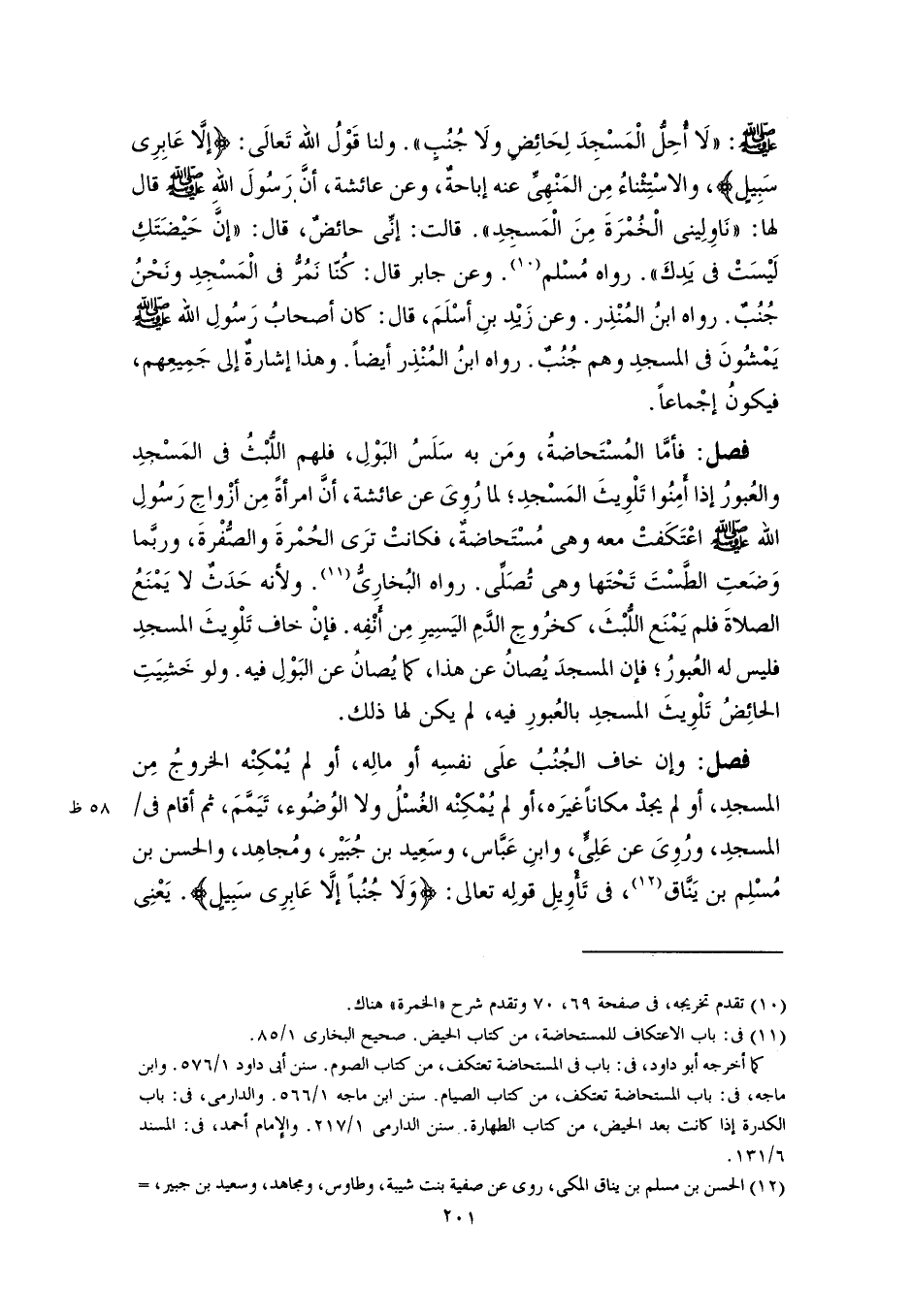 -صلى اللَّه عليه وسلم-: "لَا أُحِلُّ الْمَسْجِدَ لِحَائِضٍ ولَا جُنُبٍ". ولنا قَوْلُ اللَّه تَعالَى: {إِلَّا عَابِرِي سَبِيلٍ}، والاسْتِثْناءُ مِن المَنْهِىِّ عنه إباحةٌ، وعن عائشة، أنَّ رَسُولَ اللهِ -صلى اللَّه عليه وسلم- قال لها: "نَاوِلِينى الْخُمْرَةَ مِنَ الْمَسجِدِ". قالت: إنِّي حائضٌ، قال: "إنَّ حَيْضَتَكِ لَيْسَتْ في يَدِكِ". رواه مُسْلم (١٠). وعن جابر قال: كُنَّا نَمُرُّ في الْمَسْجِدِ ونَحْنُ جُنُبٌ. رواه ابنُ المُنْذِر. وعن زَيْدِ بنِ أَسْلَمَ، قال: كان أصحابُ رَسُولِ اللَّه -صلى اللَّه عليه وسلم- يَمْشُونَ في المسجدِ وهم جُنُبٌ. رواه ابنُ المُنْذِر أيضًا. وهذا إشارةٌ إلى جَمِيعِهم، فيكونُ إجْماعًا.