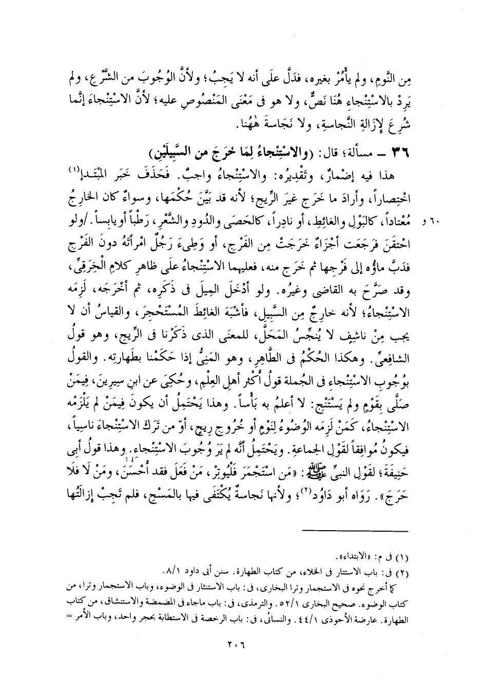 هذا فيه إضْمارٌ، وتَقْدِيرُه: والاسْتِنْجاءُ واجبٌ. فَحَذَفَ خَبَر المُبْتَدإ (١) اخْتِصارًا، وأرادَ ما خَرَج غيرَ الرِّيحِ؛ لأنه قد بَيَّنَ حُكْمَها، وسواءٌ كان الخارِجُ مُعْتادًا، كالبَولِ والغائِطِ، أو نادِرًا، كالحَصَى والدُودِ والشَّعْرِ، رَطْبًا أو يابِسًا. ولو احْتقَنَ فرَجَعَت أجْزَاءٌ خَرَجَتْ مِن الفَرْجِ، أو وَطِىءَ رَجُلٌ امْرأتَهُ دونَ الفَرْجِ فدَبَّ ماؤُه إلى فَرْجِها ثم خَرَج منه، فعليهما الاسْتِنْجاءُ علَى ظاهرِ كلامِ الْخِرَقِىِّ، وقد صَرَّحَ به القاضي وغيرُه. ولو أدْخَلَ المِيلَ في ذَكَرِه، ثم أخْرَجَه، لَزِمَه الاسْتِنْجاءُ؛ لأنه خارِجٌ مِن السَّبِيلِ، فأشْبَهَ الغائِطَ المُسْتَحْجِرَ، والقياسُ أن لا يجب مِنْ ناشِفٍ لا يُنجِّسُ المَحَلَّ، للمعنَى الذي ذَكَرْنا في الرِّيحِ، وهو قولُ الشافِعىِّ. وهكذا الحُكْمُ في الطَّاهِرِ، وهو المَنِىُّ إذا حَكَمْنا بطَهارتِه. والقولُ بوُجُوبِ الاسْتِنْجاءِ في الجُملة قولُ أَكْثر أهلِ العِلْمِ، وحُكِىَ عن ابنِ سِيرِينَ، فِيمَنْ صَلَّى بِقَومٍ ولم يَسْتَنْجِ: لا أعلمُ به بَأْسًا. وهذا يَحْتَمِلُ أن يكونَ فِيمَنْ لم يَلْزَمْه الاسْتِنْجاءُ، كَمَنْ لَزِمَه الوُضُوءُ لِنَوَمٍ أو خُرُوجِ رِيحٍ، أو من تَرَكَ الاسْتِنْجاءَ ناسِيًا، فيكونُ مُوافِقًا لقَوْلِ الجماعةِ. ويَحْتَمِلُ أنَّه لم يَرَ وُجُوبَ الاسْتِنْجاءِ. وهذا قولُ أبِي حَنِيفَةَ؛ لقَوْلِ النبيِّ -صلى اللَّه عليه وسلم-: "مَن اسْتَجْمَرَ فَلْيُوتِرْ، مَنْ فَعَلَ فقد أَحْسَنَ، ومَنْ لَا فلَا حَرَجَ". رَوَاه أبو دَاوُد (٢)؛ ولأنها نَجاسةٌ يُكْتَفَى فيها بالمَسْحِ، فلم تَجِبْ إِزالَتُها