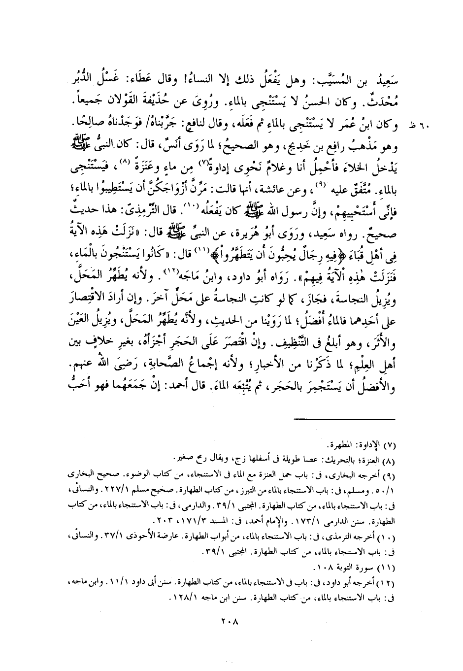 سَعِيدُ بن المُسَيَّب: وهل يَفْعَلُ ذلك إلا النساءُ! وقال عَطَاء: غَسْلُ الدُّبُر مُحْدَثٌ. وكان الحسنُ لا يَسْتَنْجِى بالماءِ. ورُوِىَ عن حُذَيْفةَ القَوْلان جَميعًا. وكان ابنُ عُمَر لا يَسْتَنْجِى بالماءِ ثم فَعَلَه، وقال لنافعٍ: جَرَّبْناهُ فوَجَدْناهُ صالِحًا. وهو مَذْهبُ رافِع بن خَدِيج، وهو الصحيحُ؛ لما رَوَى أَنَسٌ، قال: كان النبيُّ -صلى اللَّه عليه وسلم- يَدْخلُ الخلاءَ فأحْمِلُ أنا وغلامٌ نَحْوِى إداوةً (٧) مِن ماءٍ وعَنَزَةً (٨)، فيَسْتَنْجِى بالماءِ. مُتَّفَقٌ عليه (٩)، وعن عائشة، أنها قالت: مَرِّنَّ أَزْوَاجَكُنَّ أن يَسْتَطِيبوُا بالماءِ؛ فإنِّى أَسْتَحْيِيهِمْ، وإنَّ رسول اللَّه -صلى اللَّه عليه وسلم- كان يَفْعَلُه (١٠). قال التِّرْمِذِىّ: هذا حديثٌ صحيحٌ. رواه سَعِيد، ورَوَى أبُو هُرَيرة، عن النبيِّ -صلى اللَّه عليه وسلم- قال: "نَزَلَتْ هَذِه الآيَةُ فِي أهْلِ قُبَاءَ {فِيهِ رِجَالٌ يُحِبُّونَ أَنْ يَتَطَهَّرُوا} (١١) قال: "كَانُوا يَسْتَنْجُونَ بالْمَاءِ، فَنَزَلَتْ هذِهِ الْآيَةُ فِيهِمْ". رَوَاه أبُو داود، وابنُ مَاجَه (١٢). ولأنه يُطَهِّرُ المَحَلَّ، ويُزِيلُ النجاسةَ، فجَازَ، كما لو كانتِ النَّجاسةُ على مَحَلِّ آخرَ. وإن أرادَ الاقْتِصارَ على أحَدِهما فالماءُ أَفْضَلُ؛ لما رَوَيْنا من الحديثِ، ولأنَّه يُطَهِّرُ المَحَلَّ، ويُزِيلُ العَيْنَ والأَثَرَ، وهو أبلغُ في التَّنْظِيفِ. وإنْ اقْتَصَرَ عَلَى الحَجَرِ أجْزَأهُ، بغيرِ خلافٍ بين أهلِ العِلْمِ؛ لما ذَكَرْنا من الأخبارِ؛ ولأنه إجْماعُ الصَّحابةِ، رَضِىَ اللهُ عنهم. والأفضلُ أن يَسْتَجْمِرَ بالحَجَر، ثم يُتْبِعَه الماءَ. قال أحمد: إنْ جَمَعَهُما فهو أحَبُّ