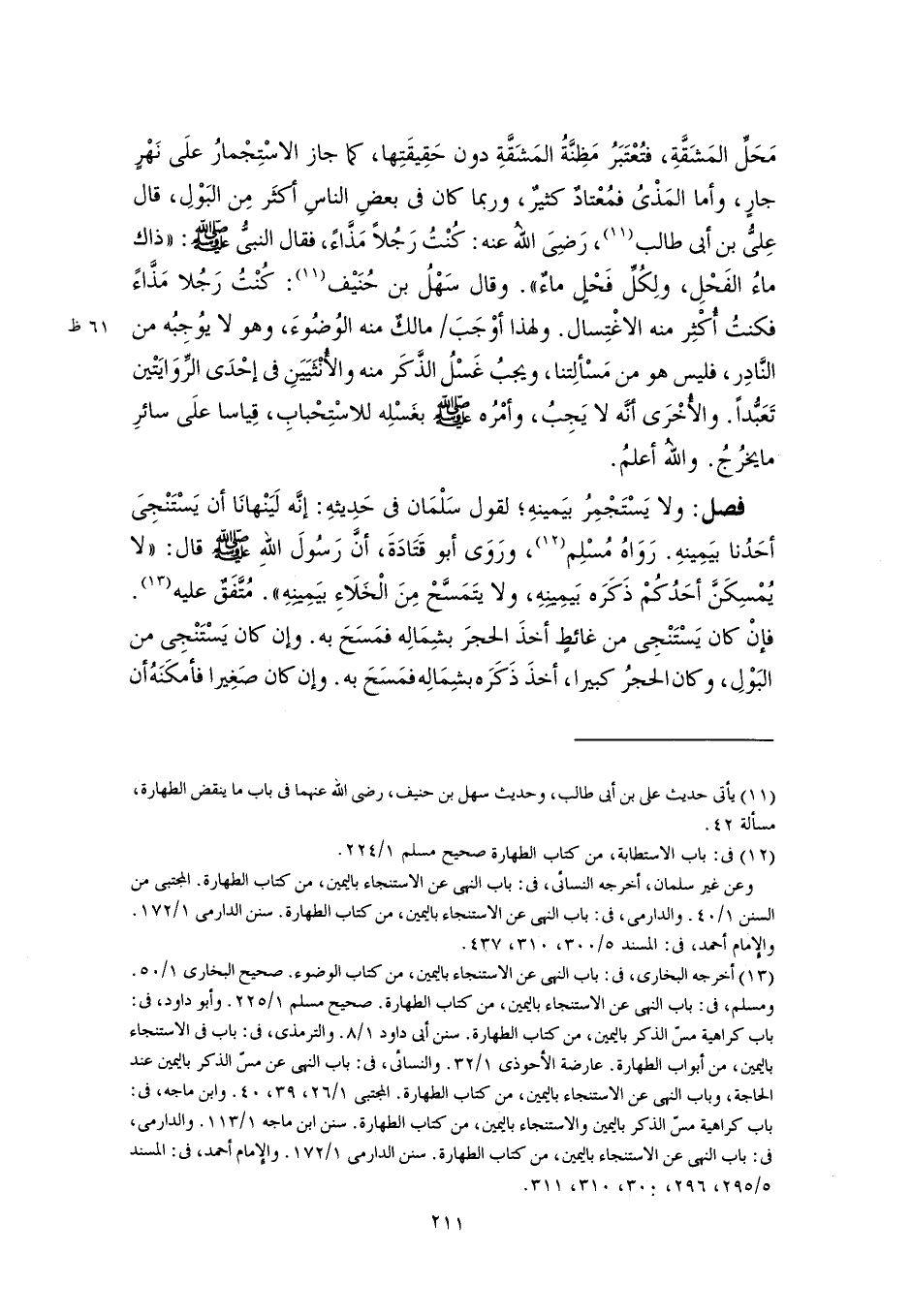 مَحَلِّ المَشَقَّةِ، فتُعْتَبَرُ مَظِنَّةُ المَشَقَّةِ دون حَقِيقَتِها، كما جاز الاسْتِجْمارُ علَى نَهْرٍ جارٍ، وأمَّا المَذْىُ فمُعْتادٌ كثيرٌ، وربما كان في بعضِ الناسِ أكثَر مِن البَوْلِ، قال عِليُّ بن أبي طالب (١١)، رَضِىَ اللَّه عنه: كُنْتُ رَجُلًا مَذَّاءً، فقال النبيُّ -صلى اللَّه عليه وسلم-: "ذاك ماءُ الفَحْلِ، ولِكُلِّ فَحْلٍ ماءٌ". وقال سَهْلُ بن حُنَيْف (١١): كُنْتُ رَجُلا مَذَّاءً فكنتُ أُكْثِر منه الاغْتِسال. ولهذا أوْجَبَ مالكٌ منه الوُضُوءَ، وهو لا يُوجِبُه من النَّادِر، فليس هو من مَسْألتِنا، ويجبُ غَسْلُ الذَّكَر منه والأُنْثَيَينِ في إحْدَى الرِّوَايَتيْن تَعَبُّدًا. والأُخْرَى أنَّه لا يَجِبُ، وأمْرُه -صلى اللَّه عليه وسلم- بغَسْلِه للاسْتِحْبابِ، قِياسًا علَى سائرِ ما يخرُجُ. واللهُ أعلمُ.