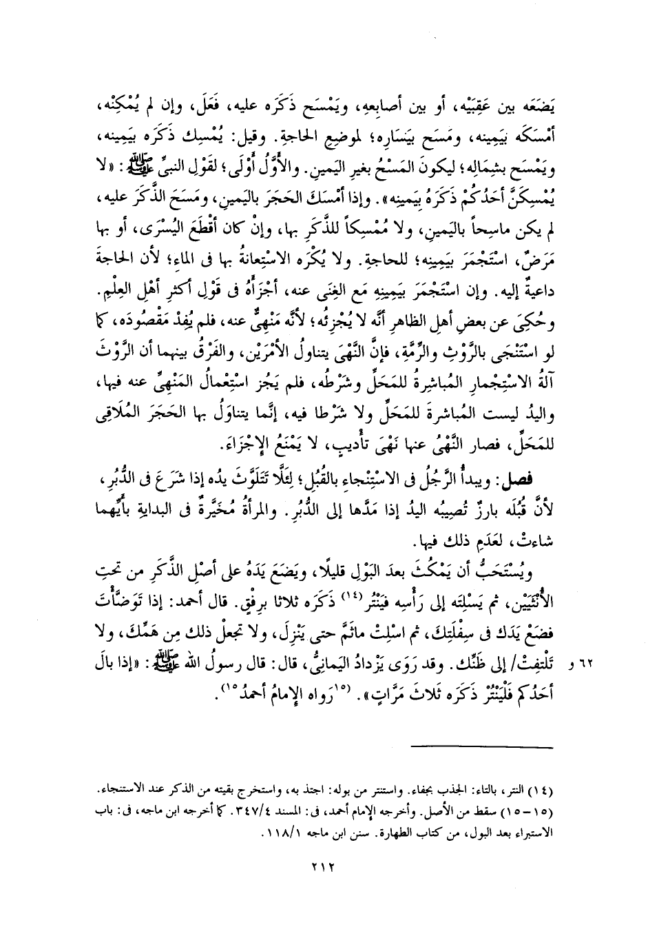 ويُسْتَحَبُّ أن يَمْكُثَ بعدَ البَوْلِ قليلًا، ويَضَعَ يَدَهُ على أصْلِ الذَّكَرِ من تحتِ الأُنْثَيَيْن، ثم يَسْلِتَه إلى رَأْسِه فيَنْتُر (١٤) ذَكَرَه ثلاثًا برِفْقٍ. قال أحمد: إذا تَوَضَّأْتَ فضَعْ يَدَك في سِفْلَتِكَ، ثم اسْلِتْ ماثَمَّ حتَّى يَنْزِلَ، ولا تجعلْ ذلك مِن هَمِّكَ، ولا تَلْتفِتْ إلى ظَنِّك. وقد رَوَى يَزْدادُ اليَمانِىُّ، قال: قال رسولُ اللَّه -صلى اللَّه عليه وسلم-: "إذا بالَ أحَدُكم فَلْيَنْتُرْ ذَكَرَه ثَلاثَ مَرَّاتٍ". [رَواه الإمامُ أحمدُ] (١٥).