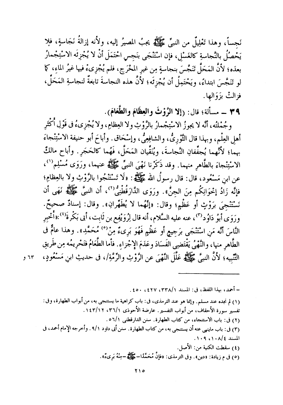 ٣٩ - مسألة؛ قال: (إلا الرَّوْثَ والعِظَامَ والطَّعَامَ).