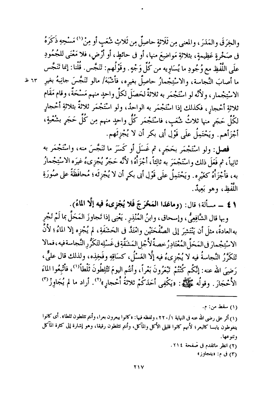 ٤١ - مسألة؛ قال: (وما عَدَا المَخْرَجَ فَلا يُجْزِىءُ فيه إلَّا الماءُ).