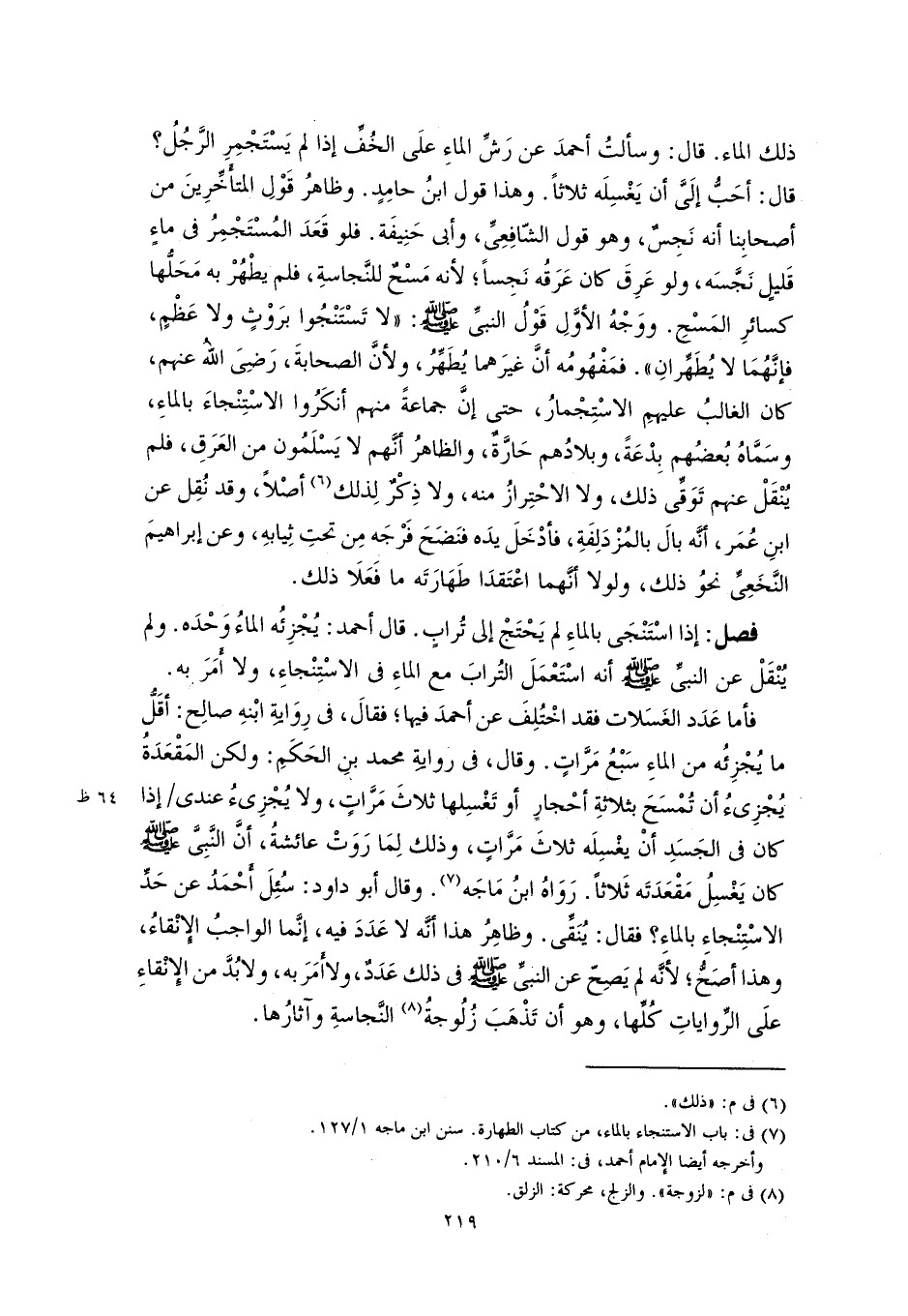 فأما عَدَد الغَسَلات فقد اخْتُلِفَ عن أحمدَ فيها؛ فقالَ، في رِوَايةِ ابْنهِ صالِح: أقَلُّ ما يُجْزِئُه من الماءِ سَبْعُ مَرَّاتٍ. وقال، في روايةِ محمد بنِ الحَكَمِ: ولكن المَقْعَدَةُ يُجْزِىءُ أن تُمْسَحَ بثلاثةِ أحْجارٍ أو تَغْسِلها ثلاثَ مَرَّاتٍ، ولا يُجْزِىءُ عندى إذا كان في الجَسَدِ أنْ يغْسِلَه ثلاثَ مَرَّاتٍ، وذلك لِمَا رَوَتْ عائشةُ، أنَّ النَّبِيَّ -صلى اللَّه عليه وسلم- كان يَغْسِلُ مَقْعَدَتَه ثَلاثًا. روَاهُ ابنُ مَاجَه (٧). وقال أبو داود: سُئِلَ أَحْمَدُ عن حَدِّ الاسْتِنْجاء بالماءِ؟ فقال: يُنَقِّى. وظاهِرُ هذا أنَّه لا عَدَدَ فيه، إنَّما الواجبُ الإِنْقاءُ، وهذا أصَحُّ؛ لأنَّه يَصِحّ عن النبيِّ -صلى اللَّه عليه وسلم- في ذلك عَدَدٌ، ولا أَمَرَ به، ولا بُدَّ من الإِنْقاءِ علَى الرِّواياتِ كُلِّها، وهو أن تَذْهَبَ زُلُوجةُ (٨) النَّجاسةِ وآثارُها.