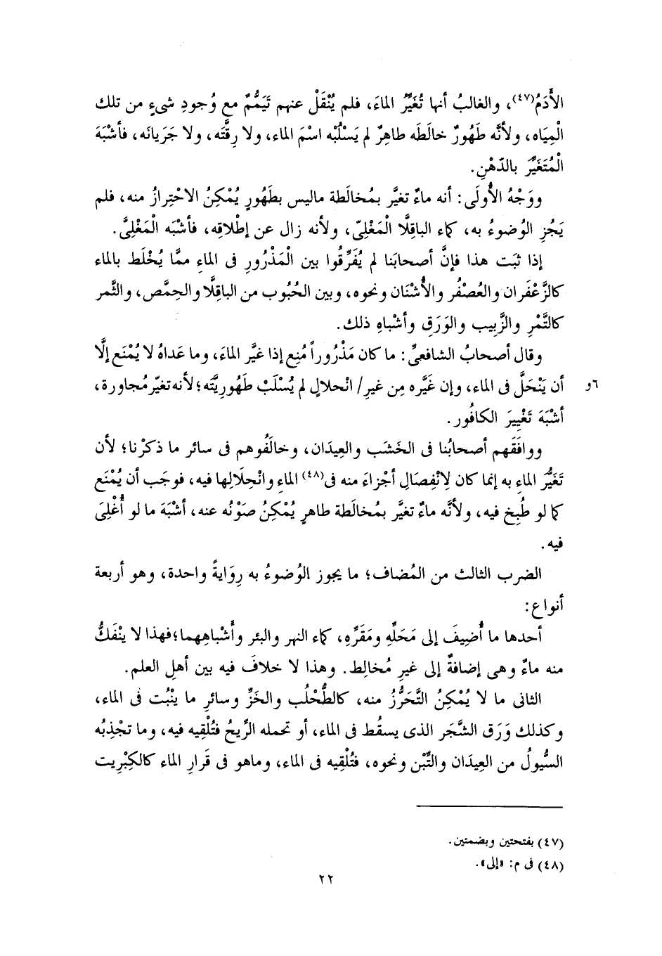 الأَدَمُ (٤٧)، والغالبُ أنَّها تُغيِّرُ الماءَ، فلم يُنْقَلْ عنهم تَيَمُّمٌ مع وُجودِ شيءٍ من تلك الْمِيَاه، ولأنَّه طَهُورٌ خالَطَه طاهِرٌ لم يَسْلُبْه اسْمَ الماء، ولا رِقَّتَه، ولا جَرَيانَه، فأشْبَهَ الْمُتَغَيِّرَ بالدّهْنِ.