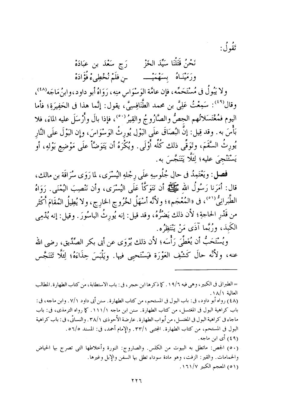 ولا يَبُولُ في مُسْتَحَمِّه، فإن عامَّة الوَسْوَاسِ مِنه، رَوَاهُ أبو داود، وابنُ مَاجَه (٤٨)، وقال (٤٩): سَمِعْتُ عَلِىَّ بن محمد الطَّنَافِسِىَّ، يقول: إنَّما هذا في الحَفِيرَةِ؛ فأما اليوم فمُغْتَسَلاتُهم الجِصُّ والصَّارُوجُ والقِيرُ (٥٠)، فإذا بالَ وأَرْسَلَ عليه الماءَ، فلا بَأْسَ به. وقد قِيل: إنَّ البُصَاقَ علَى البَوْلِ يُورِثُ الوَسْوَاسَ، وإِن البَوْلَ علَى النَّارِ يُورِثُ السَّقَمَ، وتَوَقِّى ذلك كُلِّه أَوْلَى. ويُكْرَهُ أن يَتَوَضَّأ علَى مَوْضِعِ بَوْلهِ، أو يَسْتَنْجِىَ عليه؛ لِئَلَّا يَتَنَجَّسَ به.