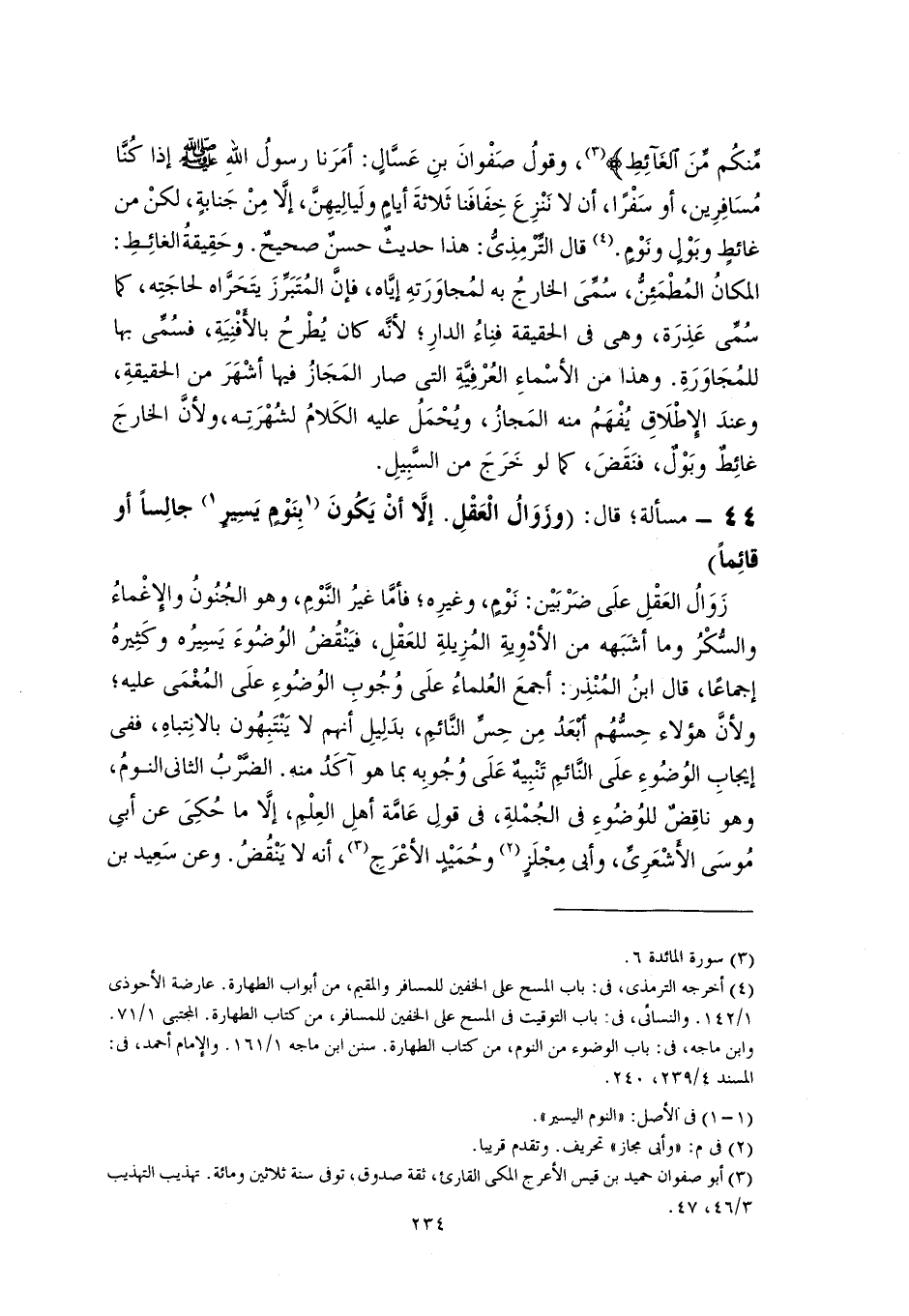 (٤) أخرجه الترمذي، في: باب المسح على الخفين للمسافر والمقيم، من أبواب الطهارة. عارضة الأحوذى ١/ ١٤٢. والنسائي، في: باب التوقيت في المسح على الخفين للمسافر، من كتاب الطهارة. المجتبى ١/ ٧١. وابن ماجه، في: باب الوضوء من النوم، من كتاب الطهارة. سنن ابن ماجه ١/ ١٦١. والإمام أحمد، في: المسند ٤/ ٢٣٩، ٢٤٠.