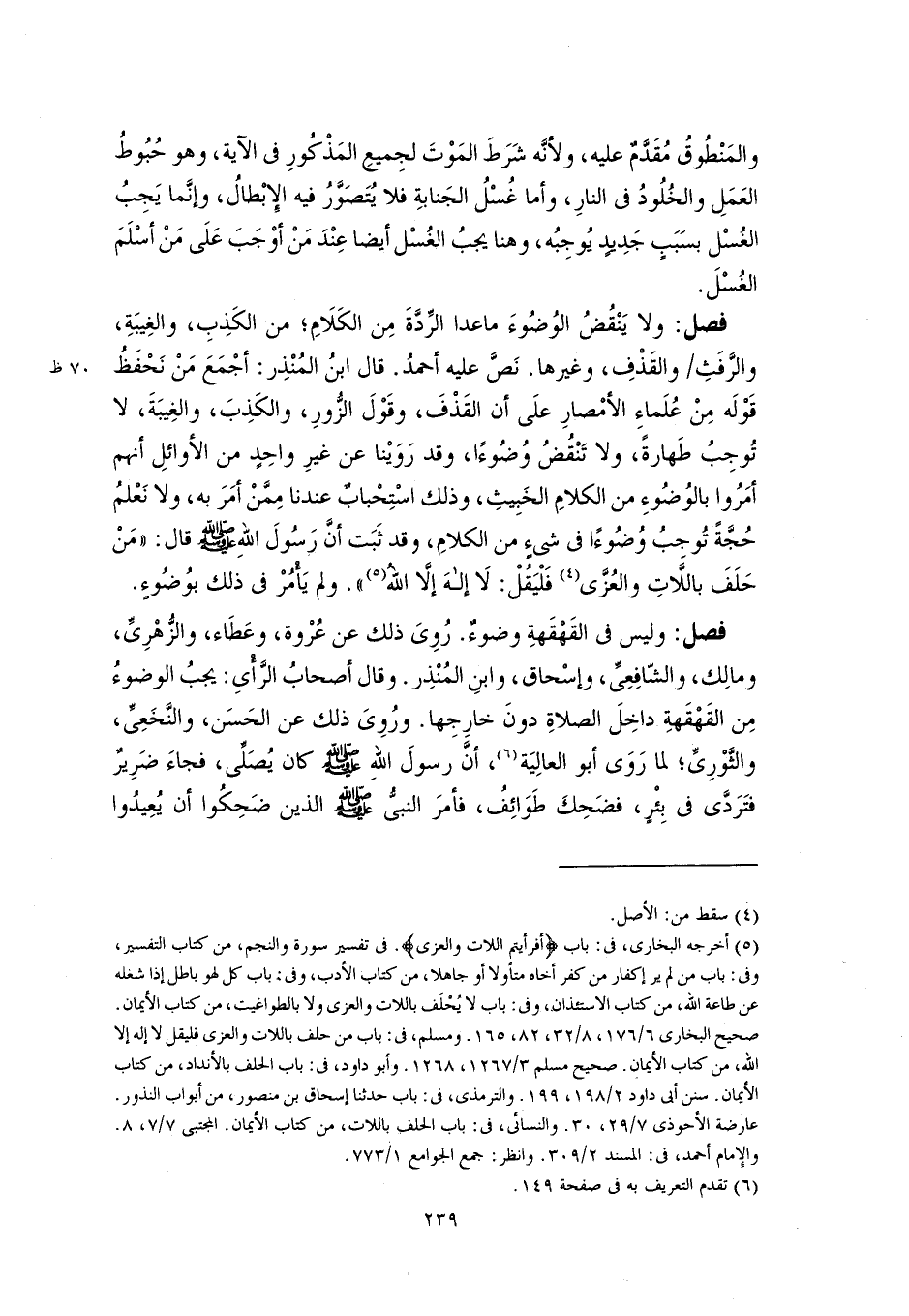 فصل: ولا يَنْقُضُ الوُضُوءَ ما عدا الرِّدَّةَ مِن الكَلَامِ؛ من الكَذِبِ، والغِيبَةِ، والرَّفَثِ والقَذْفِ، وغيرها. نَصَّ عليه أحمدُ. قال ابنُ المُنْذِر: أجْمَعَ مَنْ نَحْفَظُ قَوْلَه مِنْ عُلَماءِ الأمْصارِ علَى أن القَذْفَ، وقَوْلَ الزُّورِ، والكَذِبَ، والغِيبَةَ، لا تُوجِبُ طَهارةً، ولا تَنْقُضُ وُضُوءًا، وقد رَوَيْنا عن غيرِ واحِدٍ من الأوائلِ أنهم أمَرُوا بالوُضُوءِ من الكلامِ الخَبِيثِ، وذلك اسْتِحْبابٌ عندنا مِمَّنْ أمَرَ به، ولا نَعْلمُ حُجَّةً تُوجبُ وُضُوءًا في شيء من الكلامِ، وقد ثَبَت أنَّ رَسُولَ اللهِ -صلى اللَّه عليه وسلم- قال: "مَنْ حَلَفَ باللَّاتِ والعُزَّى (٤) فَلْيَقُلْ: لَا إلهَ إلَّا اللهُ (٥) ". ولم يَأْمُرْ في ذلك بوُضُوءٍ.