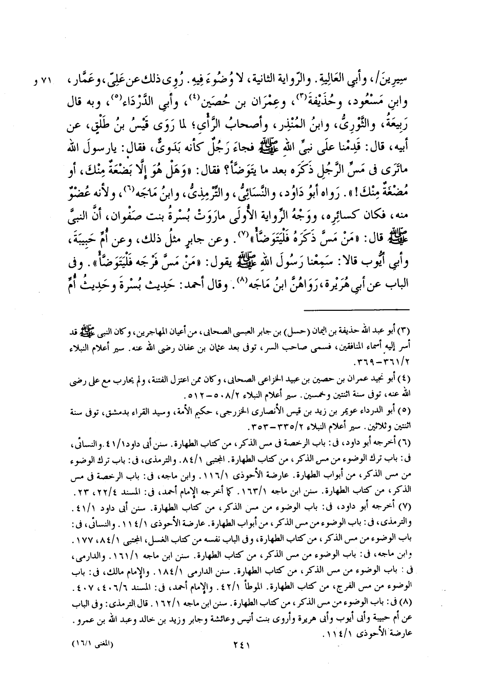 (٨) في: باب الوضوء من مس الذكر، من كتاب الطهارة. سنن ابن ماجه ١/ ١٦٢. قال الترمذي: وفي الباب عن أم حبيبة وأبى أيوب وأبي هريرة وأروى بنت أنيس وعائشة وجابر وزيد بن خالد وعبد اللَّه بن عمرو. عارضة الأحوذى ١/ ١١٤.