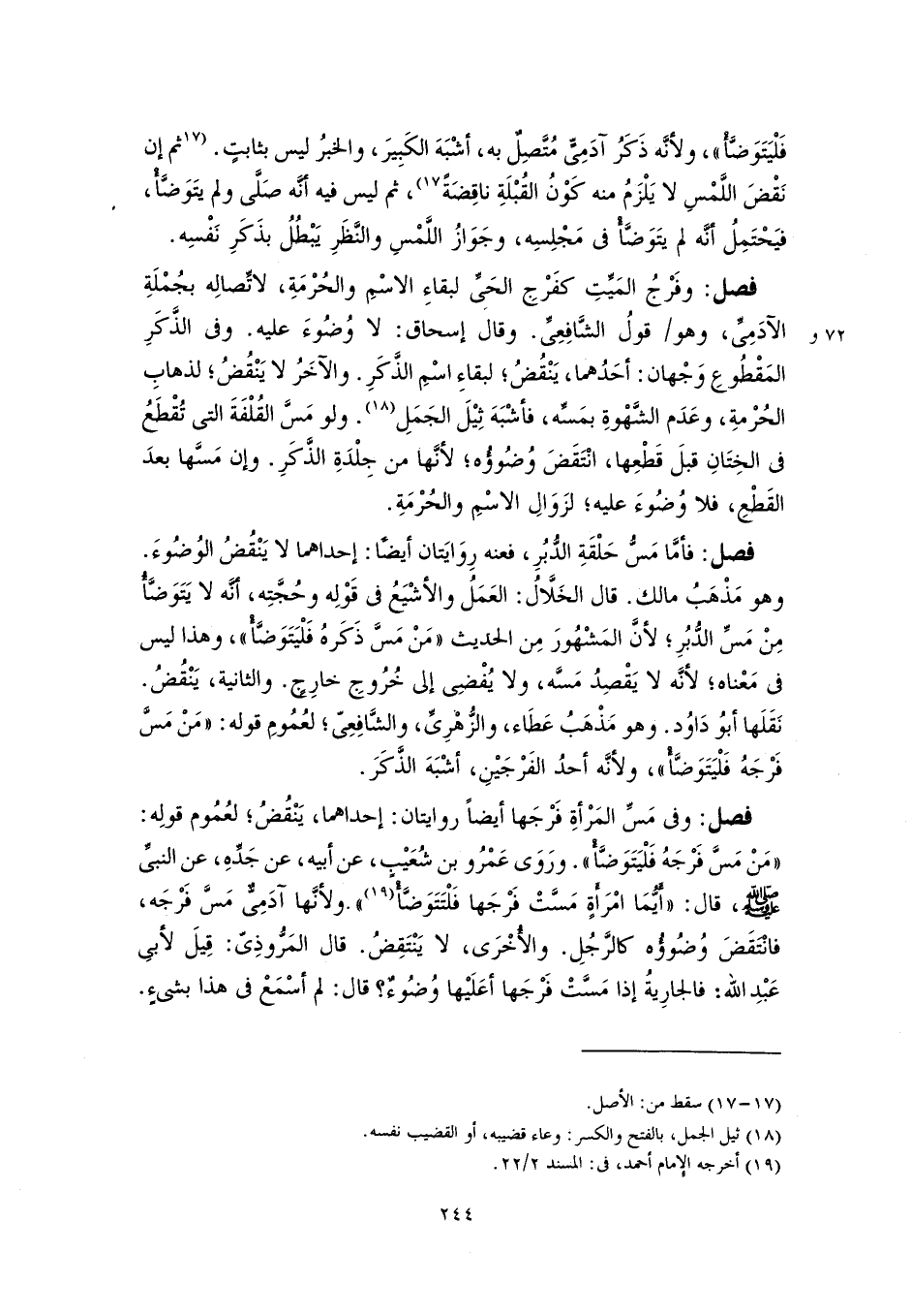 فصل: فأمَّا مَسُّ حَلْقَةِ الدُّبُرِ، فعنه رِوَايَتان أيضًا: إحداهما لا يَنْقُضُ الوُضُوءَ. وهو مَذْهَبُ مالك. قال الخَلَّالُ: العَمَلُ والأشْيَعُ في قَوْلِه وحُجَّتِه، أنَّه لا يَتَوَضَّأُ مِنْ مَسِّ الدُّبُرِ؛ لأنَّ المَشْهُورَ مِن الحديث "مَنْ مَسَّ ذَكَرهُ فَلْيَتَوَضَّأْ"، وهذا ليس في مَعْناه؛ لأنَّه لا يَقْصِدُ مَسَّه، ولا يُفْضِى إلى خُرُوجِ خارِجٍ. والثانية، يَنْقُضُ. نَقلَها أبُو دَاوُد. وهو مَذْهَبُ عَطَاء، والزُّهْرِيِّ، والشَّافِعِيّ؛ لعُمُومِ قوله: "مَنْ مَسَّ فَرْجَهُ فَلْيَتَوَضَّأْ"، ولأنَّه أحدُ الفَرْجَيْنِ، أشْبَهَ الذَّكَرَ.