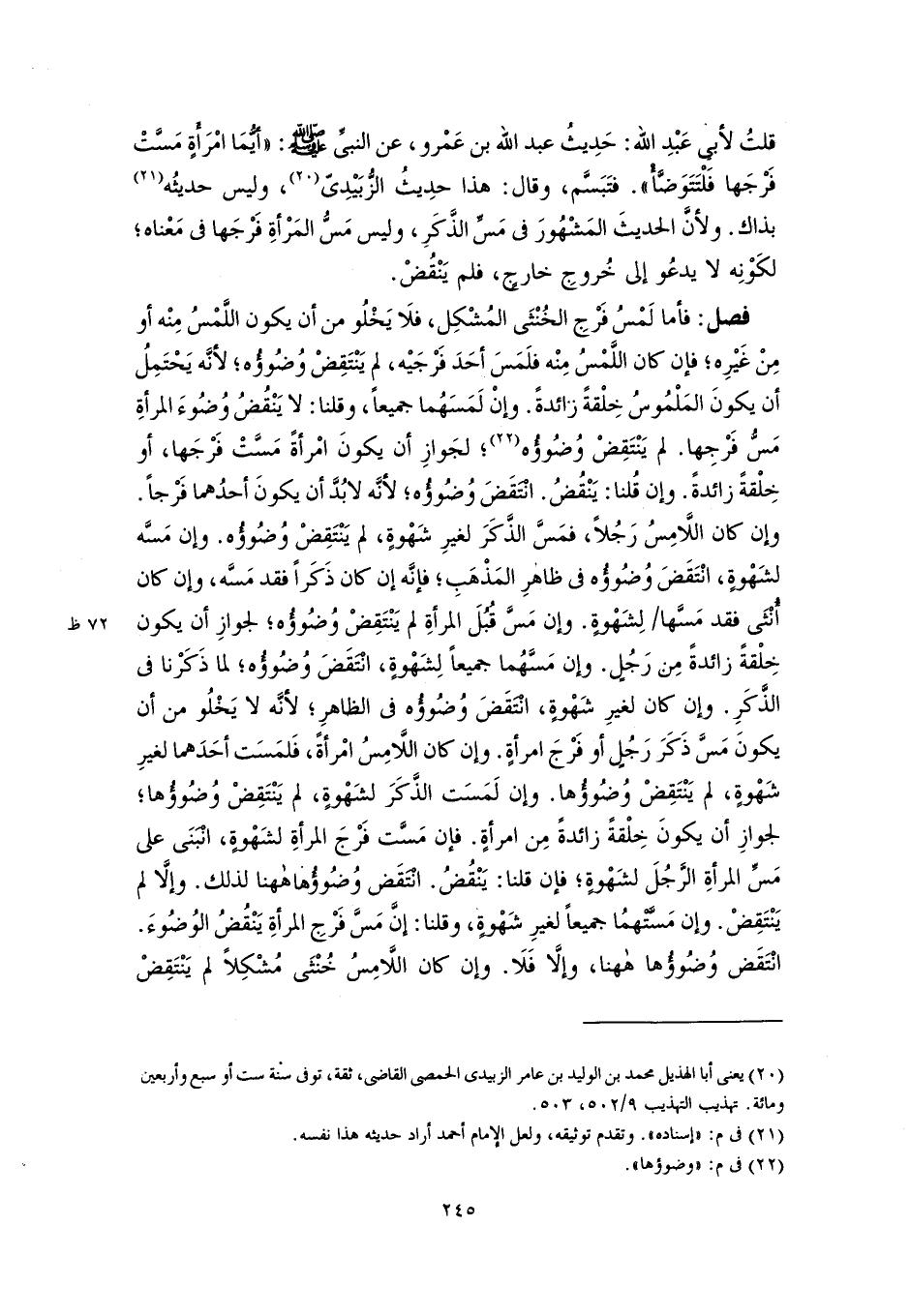 قلتُ لأبي عَبْدِ اللَّه: حَدِيثُ عبد اللَّه بن عَمْرو، عن النبيِّ -صلى اللَّه عليه وسلم-: "أيُّمَا امْرَأةٍ مَسَّتْ فَرْجَها فَلْتَتَوَضَّأْ". فتَبَسَّم، وقال: هذا حدِيثُ الزُّبَيْدِىّ (٢٠)، وليس حديثُه (٢١) بذاك. ولأنَّ الحديثَ المَشْهُورَ في مَسِّ الذَّكَرِ، وليس مَسُّ المَرْأةِ فَرْجَها في مَعْناه؛ لكَوْنِه لا يدعُو إلى خُروجِ خارجٍ، فلم يَنْقُضْ.