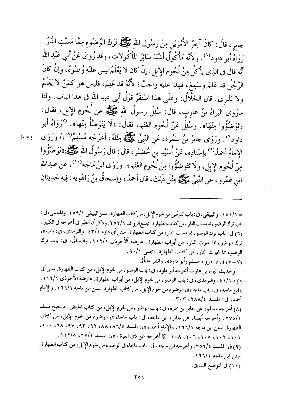 (٨) أخرجه مسلم، عن جابر بن سمرة، في: باب الوضوء من لحوم الإبل، من كتاب الحيض. صحيح مسلم ١/ ٢٧٥. وأخرجه أيضًا، عن جابر، ابن ماجه، في: باب ما جاء في الوضوء من لحوم الإبل، من كتاب الطهارة. سنن ابن ماجه ١/ ١٦٦. والإمام أحمد، في: المسند ٥/ ٨٦، ٨٨، ٩٢، ٩٣، ٩٧، ٩٨، ١٠٠، ١٠١، ١٠٢، ١٠٥، ١٠٦، ١٠٨. كما أخرجه عن ذى الغرة، في: المسند ٤/ ٦٧، ٥/ ١١٢.
