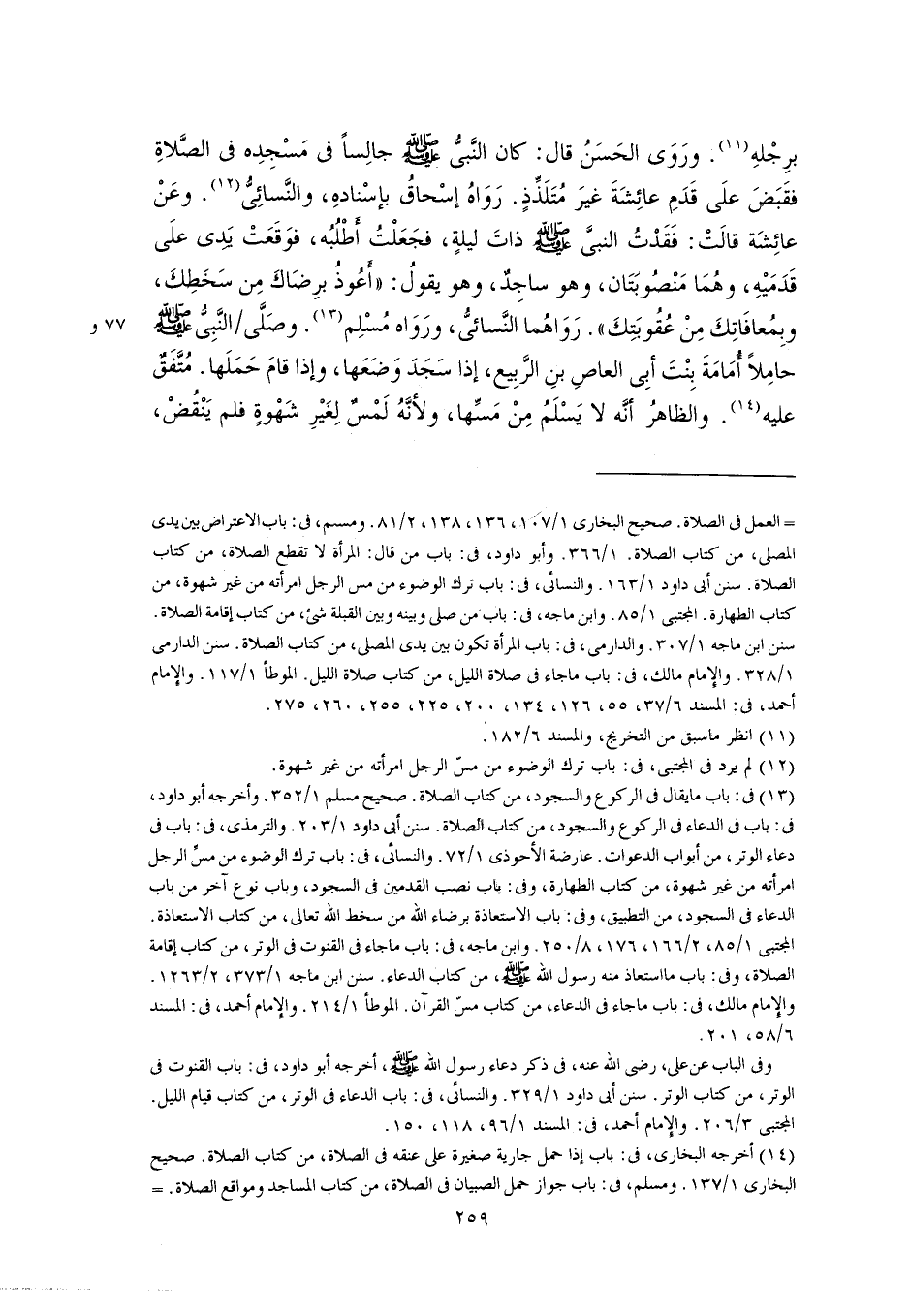 = العمل في الصلاة. صحيح البخاري ١/ ١٠٧، ١٣٦، ١٣٨، ٢/ ٨١. ومسلم، في: باب الاعتراض بين يدى المصلى، من كتاب الصلاة. ١/ ٣٦٦. وأبو داود، في: باب من قال: المرأة لا تقطع الصلاة، من كتاب الصلاة. سنن أبي داود ١/ ١٦٣. والنسائي، في: باب ترك الوضوء من مس الرجل امرأته من غير شهوة، من كتاب الطهارة. المجتبى ١/ ٨٥. وابن ماجه، في: باب من صلى وبينه وبين القبلة شيء، من كتاب إقامة الصلاة. سنن ابن ماجه ١/ ٣٠٧. والدارمى، في: باب المرأة تكون بين يدى المصلى، من كتاب الصلاة. سنن الدارمي ١/ ٣٢٨. والإمام مالك، في: باب ما جاء في صلاة الليل، من كتاب صلاة الليل. الموطأ ١/ ١١٧. والإمام أحمد، في: المسند ٦/ ٣٧، ٥٥، ١٢٦، ١٣٤، ٢٠٠، ٢٢٥، ٢٥٥، ٢٦٠، ٢٧٥.
