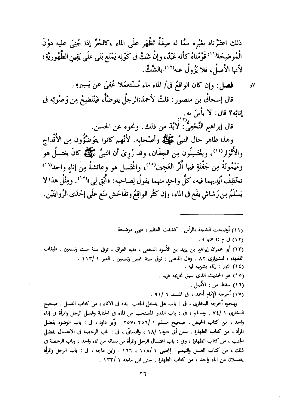 قال إبراهيم النَّخَعِيُّ (١٣): لا بُدَّ من ذلك. ونحوه عن الحسن. وهذا ظاهر حال النبيِّ -صلى اللَّه عليه وسلم- وأصْحابِه. لأنَّهم كانوا يتوَضَّؤُون مِن الأَقْداحِ والأَتْوَار (١٤)، ويَغْتَسِلُون مِن الجِفَان، وقد رُوِىَ أن النبيَّ -صلى اللَّه عليه وسلم- كانَ يغتسلُ هو ومَيْمُونَةُ مِن جَفْنَةٍ فيها أَثَرُ العَجِين (١٥)، واغْتَسل هو وعائشةُ مِن إناءٍ واحد (١٦) تخْتَلِفُ أَيْدِيهما فيه، كلُّ واحدٍ منهما يقولُ لِصاحبِه: "أَبْقِ لِى" (١٧). ومِثْلُ هذا لا يَسْلَمُ مِن رَشاشٍ يقَع في الماء، وإن كثُر الواقِعُ وتفَاحَش منَع علَى إحْدَى الرِّوايتَيْن.