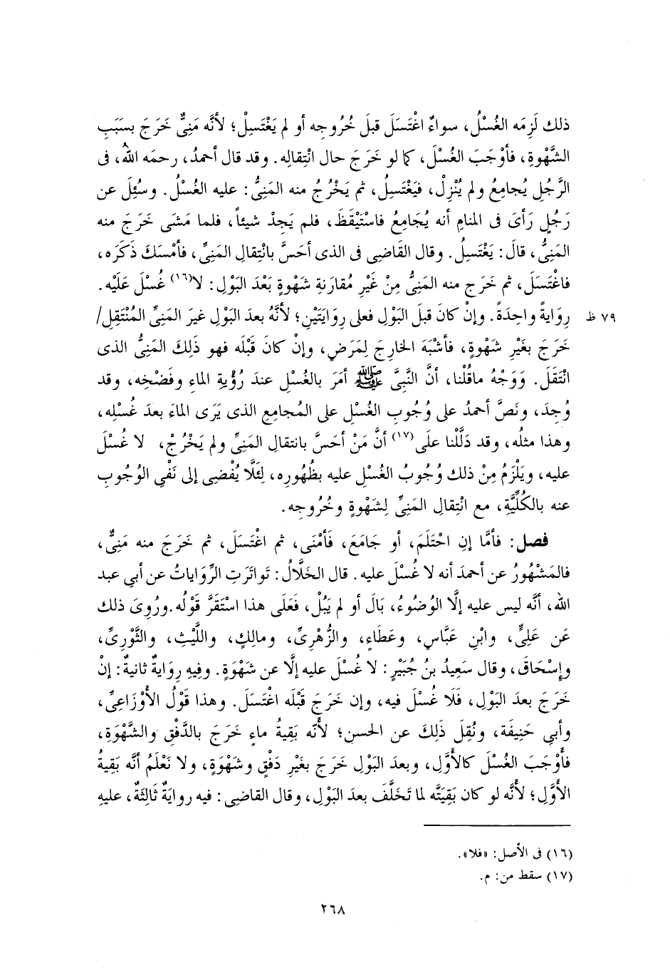 ذلك لَزِمَه الغُسْلُ، سواءٌ اغْتَسَلَ قبلَ خُرُوجِه أو لم يَغْتَسِلْ؛ لأنَّه مَنِىٌّ خَرَجَ بسَبَبِ الشَّهْوةِ، فأوْجَبَ الغُسْلَ، كما لو خَرَجَ حال انْتِقالِه. وقد قال أحمدُ، رحمَه اللهُ، في الرَّجُلِ يُجامِعُ ولم يُنْزِلْ، فيَغْتَسِلُ، ثم يَخْرُجُ منه المَنِىُّ: عليه الغُسْلُ. وسُئِلَ عن رَجُلٍ رَأىَ في المنامِ أنه يُجَامِعُ فاسْتَيْقَظَ، فلم يَجِدْ شيئًا، فلما مَشَى خَرَجَ منه المَنِىُّ، قالَ: يَغْتَسِلُ. وقال القَاضِى في الذي أحَسَّ بانْتِقالِ المَنِىِّ، فأمْسَكَ ذَكَرَه، فاغْتَسَلَ، ثم خَرَج منه المَنِىُّ مِنْ غَيْرِ مُقارَنةِ شَهْوةٍ بَعْدَ البَوْلِ: لا (١٦) غُسْلَ عَلَيْه. رِوَايةً واحِدَةً. وإنْ كانَ قبلَ البَوْلِ فعلى رِوَايَتَيْنِ؛ لأنَّهُ بعدَ البَوْلِ غيرَ المَنِىِّ المُنْتَقِلِ خَرَجَ بغَيْرِ شَهْوةٍ، فأشْبَهَ الخارِجَ لِمَرَضٍ، وإنْ كانَ قَبْلَه فهو ذَلِكَ المَنِىُّ الذي انْتَقَلَ. وَوَجْهُ ما قُلْنا، أنَّ النَّبِىَّ -صلى اللَّه عليه وسلم- أمَرَ بالغُسْلِ عندَ رُؤْيةِ الماءِ وفَضْخِه، وقد وُجِدَ، ونَصَّ أحمدُ على وُجُوبِ الغُسْلِ على المُجامِعِ الذي يَرَى الماءَ بعدَ غُسْلِه، وهذا مثلُه، وقد دَلَّلْنا علَى (١٧) أنَّ مَنْ أحَسَّ بانتقالِ المَنِىِّ ولم يَخْرُجْ، لا غُسْلَ عليه، ويَلْزَمُ مِنْ ذلك وُجُوبُ الغُسْلِ عليه بظُهُورِه، لِئَلَّا يُفْضِى إلى نَفْىِ الوُجُوبِ عنه بالكُلِّيَّةِ، مع انْتِقالِ المَنِىِّ لِشَهْوةٍ وخُرُوجِه.