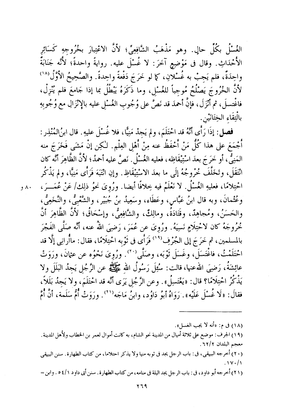 فصل: إذَا رَأَى أنَّهُ قد احْتَلَمَ، ولم يَجِدْ مَنِيًّا، فلا غُسْلَ عليهِ. قال ابنُ المُنْذِر: أَجْمَعَ على هذا كُلُّ مَنْ أَحْفَظُ عنه مِنْ أَهْلِ العِلْمِ. لكِن إنْ مَشَى فَخَرَجَ منه المَنِىُّ، أو خَرَجَ بعدَ اسْتِيْقَاظِه، فعليه الغُسْلُ. نَصَّ عليه أحمدُ؛ لأنَّ الظَّاهِرَ أنَّه كان انْتَقَلَ، وتَخَلَّفَ خُرُوجُهُ إلَى ما بعدَ الاسْتِيْقَاظِ. وإنِ انْتَبَهَ فَرَأَى مَنِيًّا، ولم يَذْكُر احْتِلامًا، فعليهِ الغُسْلُ. لا نَعْلَمُ فيه خِلافًا أيضًا. ورُوِىَ نحوُ ذلِك عَنْ عُمَرَ، وعُثْمانَ، وبه قال ابنُ عَبَّاسٍ، وعَطَاء، وسَعِيدُ بنُ جُبَيْر، والشَّعْبِىُّ، والنَّخَعِىُّ، والحَسَنُ، ومُجاهِدٌ، وقَتَادَةُ، ومالِكٌ، والشَّافِعِىُّ، وإسْحَاقُ؛ لأنَّ الظَّاهِرَ أنَّ خُرُوجَهُ كان لاحْتِلَامٍ نَسِيَهُ. ورُوِىَ عن عُمَرَ، رَضِىَ اللهُ عنه، أنَّه صَلَّى الفَجْرَ بالمسلمين، ثم خَرَجَ إلى الجُرْفِ (١٩) فَرَأَى في ثَوْبِه احْتِلَامًا، فقال: ما أُرانِى إلَّا قد احْتَلَمْتُ، فاغْتَسَلَ، وغَسَلَ ثَوْبَه، وصَلَّى (٢٠). ورُوِىَ نَحْوُه عن عثمانَ، ورَوَتْ عائِشَةُ، رَضِىَ اللَّه عنها، قالت: سُئِلَ رَسُولُ اللهِ -صلى اللَّه عليه وسلم- عن الرَّجُلِ يَجِدُ البَلَلَ ولا يَذْكُرُ احْتِلَامًا؟ قال: "يَغْتَسِلُ". وعن الرَّجُلِ يَرَى أنَّه قد احْتَلَمَ، ولا يَجِدُ بَلَلًا، فقالَ: "لَا غُسْلَ عَلَيْه". رَوَاهُ أبُو دَاوُد، وابنُ مَاجَه (٢١). ورَوَتْ أُمُّ سَلَمة، أنَّ أُمَّ