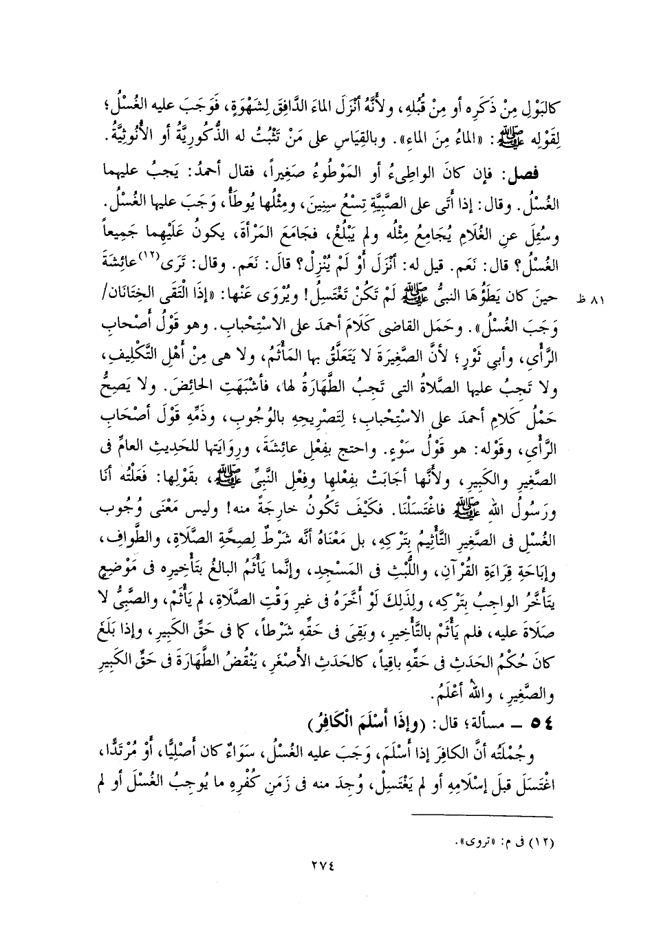 فصل: فإن كانَ الواطِىءُ أو المَوْطُوءُ صَغِيرًا، فقال أحمدُ: يَجبُ عليهما الغُسْلُ. وقال: إذا أَتَى على الصَّبِيَّةِ تِسْعُ سِنِينَ، ومِثْلُها يُوطَأُ، وَجَبَ عليها الغُسْلُ. وسُئِلَ عنِ الغُلَامِ يُجَامِعُ مِثْلُه ولم يَبْلُغْ، فجَامَعَ المَرْأةَ، يكونُ عَلَيْهِما جَمِيعًا الغُسْلُ؟ قال: نَعَم. قيل له: أنْزَلَ أَوْ لَمْ يُنْزِلْ؟ قالَ: نَعَم. وقال: تَرَى (١٢) عائِشَةَ حينَ كان يَطؤُهَا النبيُّ -صلى اللَّه عليه وسلم- لَمْ تَكُنْ تَغْتَسِلُ! ويُرْوَى عَنْها: "إذَا الْتَقَى الخِتَانَان وَجَبَ الغُسْلُ". وحَمَل القاضي كَلَامَ أحمدَ على الاسْتِحْبابِ. وهو قَوْلُ أَصْحابِ الرَّأْىِ، وأبِى ثَوْرٍ؛ لأنَّ الصَّغِيرَةَ لا يَتَعَلَّقُ بها المَأْثَمُ، ولا هي مِنْ أَهْلِ التَّكْلِيفِ، ولا تَجِبُ عليها الصَّلاةُ التي تَجِبُ الطَّهَارَةُ لها، فأشْبَهَتِ الحائِضَ. ولا يَصِحُّ حَمْلُ كَلامِ أحمدَ على الاسْتِحْبابِ؛ لِتَصْرِيحِهِ بالوُجُوبِ، وذَمِّهِ قَوْلَ أصْحَابِ الرَّأْىِ، وقَوْله: هو قَوْلُ سَوْءٍ. واحتج بفِعْلِ عائِشَةَ، ورِوَايَتها للحَدِيثِ العامِّ في الصَّغِيرِ والكَبِيرِ، ولأَنَّها أجَابَتْ بفِعْلهِا وفِعْلِ النَّبِيِّ -صلى اللَّه عليه وسلم-، بقَوْلِها: فَعَلْتُه أنَا ورَسُولُ اللهِ -صلى اللَّه عليه وسلم- فاغْتَسَلْنَا. فكَيْفَ تَكُونُ خارِجَةً منه! وليس مَعْنَى وُجُوب الغُسْلِ في الصَّغِيرِ التَّأْثِيمُ بِتَرْكِهِ، بل مَعْنَاهُ أنَّه شَرْطٌ لِصِحَّةِ الصَّلَاةِ، والطَّوافِ، وإبَاحَةِ قِرَاءَةِ القُرْآنِ، واللُّبْثِ في المَسْجِدِ، وإنَّما يَأْثَمُ البالغُ بتَأْخِيرِه في مَوْضِعٍ يتَأَخَّرُ الواجِبُ بِتَرْكِه، ولِذَلِكَ لَوْ أَخَّرَهُ في غيرِ وَقْتِ الصَّلَاةِ، لم يَأْثَمْ، والصَّبِىُّ لا صَلَاةَ عليه، فلم يَأْثَمْ بالتَّأْخِيرِ، وبَقِىَ في حَقِّهِ شَرْطًا، كما في حَقِّ الكَبِيرِ، وإذا بَلَغ كانَ حُكْمُ الحَدَثِ في حَقِّهِ باقِيًا، كالحَدَثِ الأَصْغَرِ، يَنْقُضُ الطَّهَارَةَ في حَقِّ الكَبِيرِ والصَّغِيرِ، واللهُ أعْلَمُ.