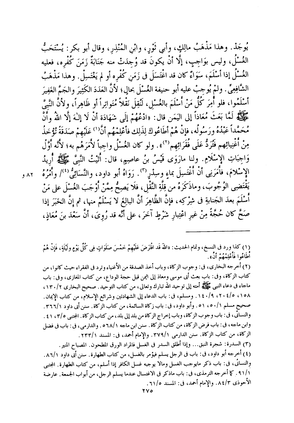 يُوجَدْ. وهذا مَذْهَبُ مالِكٍ، وأبِى ثَوْرٍ، وابْنِ المُنْذِرِ، وقال أبو بكر: يُسْتَحَبُّ الغُسْلُ، وليس بوَاجِبٍ، إلَّا أنْ يكونَ قد وُجِدَتْ منه جَنَابَةٌ زَمَنَ كُفْرِه، فعليه الغُسْلُ إذا أسْلَمَ، سَوَاءٌ كان قد اغْتَسَلَ في زَمَنِ كُفْرِه أو لم يَغْتَسِلْ. وهذا مَذْهَبُ الشَّافِعِىِّ. ولمْ يُوجِبْ عليه أبو حنيفة الغُسْلَ بحالٍ؛ لأنَّ العَدَدَ الكَثِيرَ والجَمَّ الغَفِيرَ أسْلَمُوا، فلو أُمِرَ كُلُّ مَنْ أَسْلَمَ بالغُسْلِ، لَنُقِلَ نَقْلًا مُتَواتِرًا أو ظَاهِرًا، ولأنَّ النَّبِىَّ -صلى اللَّه عليه وسلم- لَمَّا بَعَثَ مُعَاذًا إلى اليَمَن قال: "ادْعُهُمْ إلَى شَهَادَة أنْ لَا إلهَ إلَّا اللهُ وأنَّ مُحَمَّدًا عَبْدُهُ ورَسُولُه، فإنْ هُمْ أطَاعُوكَ لِذَلِك فأعْلِمْهُم أنَّ (١) عَلَيْهِمْ صَدَقَةً تُؤْخَذُ مِنْ أغْنِيائِهم فَتُرَدُّ عَلَى فُقَرَائِهِم (٢) ". ولو كان الغُسْلُ واجِبًا لأَمَرَهُم به؛ لأَنَّه أَوَّلُ وَاجِبَاتِ الإِسْلَامِ. ولنا ما رَوَى قَيْسُ بنُ عاصِمٍ، قال: أَتَيْتُ النَّبِىَّ -صلى اللَّه عليه وسلم- أُرِيدُ الإِسْلامَ، فأَمَرَنِى أنْ أَغْتَسِلَ بماءٍ وسِدْرٍ (٣). رَوَاهُ أبو داود، والنَّسَائِىُّ (٤) وأمْرُهُ يَقْتَضِى الوُجُوبَ، وما ذَكَرَهُ من قِلَّةِ النَّقْلِ، فلَا يَصِحُّ مِمَّنْ أَوْجَبَ الغُسْلَ على مَنْ أَسْلَمَ بعدَ الجَنابةِ في شِرْكِه، فإنَّ الظَّاهِرَ أنَّ البالِغَ لا يَسْلَمُ منها، ثم إِنَّ الخبَرَ إذا صَحَّ كان حُجَّةً مِنْ غيرِ اعْتِبارِ شَرْطٍ آخَرَ، على أنَّه قد رُوِىَ، أنَّ سَعْدَ بنَ مُعَاذٍ،
