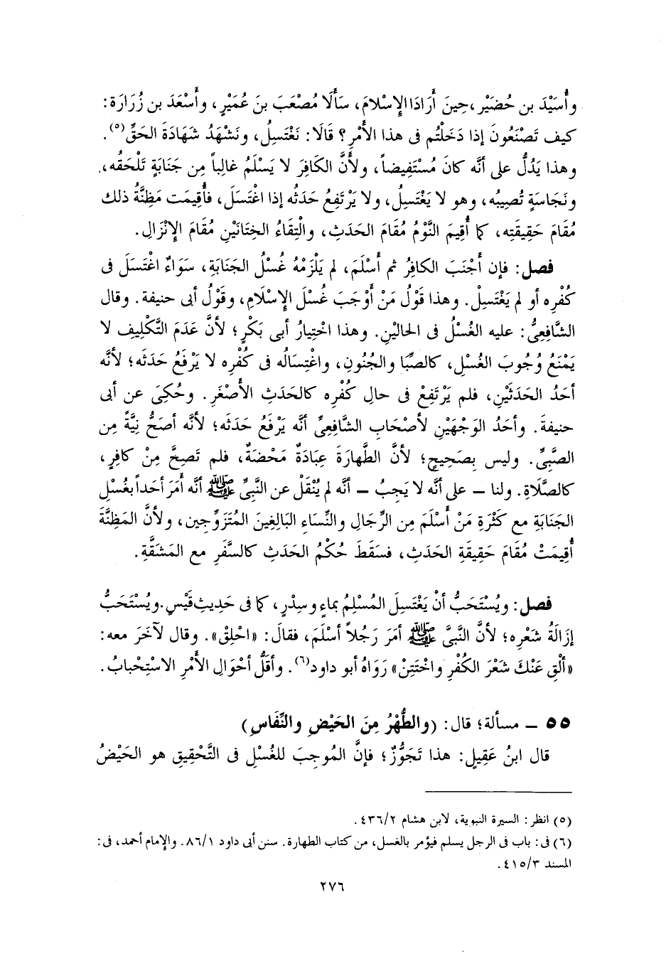 وأُسَيْدَ بن حُضَيْر، حِينَ أَرَادَا الإِسْلامَ، سَأَلَا مُصْعَبَ بنَ عُمَيْرٍ، وأَسْعَدَ بن زُرَارَة: كيف تَصْنَعُونَ إذا دَخَلْتُم في هذا الأَمْرِ؟ قَالَا: نَغْتَسِلُ، ونَشْهَدُ شَهَادَةَ الحَقِّ (٥). وهذا يَدُلُّ على أنَّه كانَ مُسْتَفِيضًا، ولأَنَّ الكَافِرَ لا يَسْلَمُ غالِبًا مِن جَنَابَةٍ تَلْحَقُه، ونَجَاسَةٍ تُصِيبُه، وهو لا يَغْتَسِلُ، ولا يَرْتَفِعُ حَدَثُه إذا اغْتَسَلَ، فأُقِيمَت مَظِنَّةُ ذلك مُقَامَ حَقِيقَتِه، كما أُقِيمَ النَّوْمُ مُقَامَ الحَدَثِ، والْتِقَاءُ الخِتَانَيْنِ مُقَامَ الإِنْزَالِ.