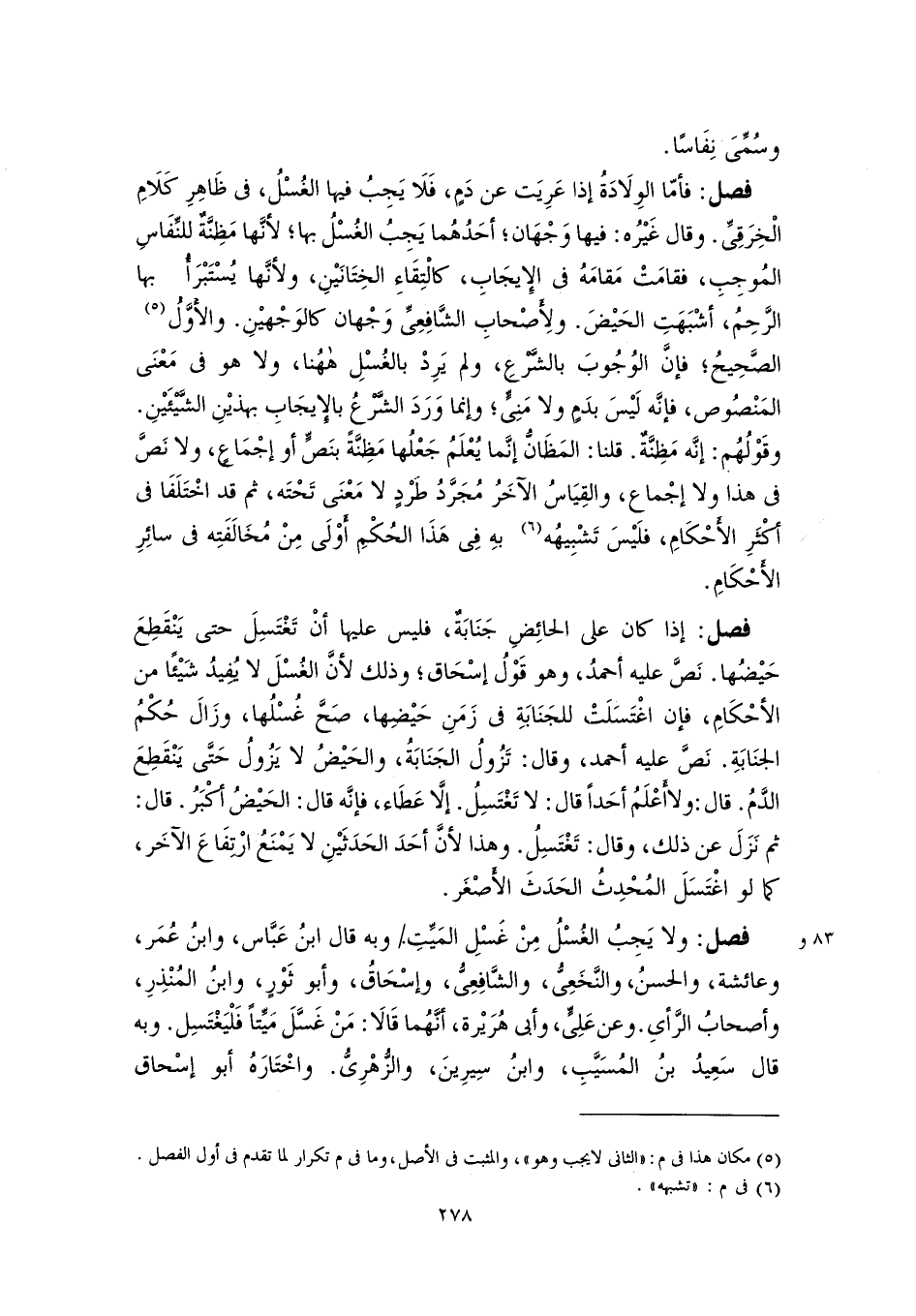 فصل: فأمّا الوِلَادَةُ إذا عَرِيَت عن دَمٍ، فَلَا يَجِبُ فيها الغُسْلُ، في ظَاهِرِ كَلَامِ الْخِرَقِىِّ. وقال غَيْرُه: فيها وَجْهَان؛ أحَدُهُما يَجِبُ الغُسْلُ بها؛ لأنَّها مَظِنَّةٌ للنِّفَاسِ المُوجِبِ، فقامَتْ مَقامَهُ في الإِيجَابِ، كالْتِقَاءِ الخِتَانَيْنِ، ولأنَّها يُسْتَبْرَأُ بها الرَّحِمُ، أشْبَهَتِ الحَيْضَ. ولِأَصْحابِ الشَّافِعِىِّ وَجْهان كالوَجْهيْنِ. والأوَّلُ (٥) الصَّحِيحُ؛ فإنَّ الوُجُوبَ بالشَّرْعِ، ولم يَرِدْ بالغُسْلِ ههُنا، ولا هو في مَعْنَى المَنْصُوص، فإنَّه لَيْسَ بدَمٍ ولا مَنِىٍّ؛ وإنما وَرَدَ الشَّرْعُ بالإِيجَابِ بهذيْنِ الشَّيْئَيْنِ. وقَوْلُهُمْ: إنَّه مَظِنَّةٌ. قلنا: المَظَانُّ إنَّما يُعْلَمُ جَعْلُها مَظِنَّةً بنَصٍّ أو إجْمَاعٍ، ولا نَصَّ في هذا ولا إجْماع، والقِيَاسُ الآخَرُ مُجَرَّدُ طَرْدٍ لا مَعْنَى تَحْتَه، ثم قد اخْتَلَفَا في أكثَرِ الأَحْكَامِ، فلَيْسَ تَشْبِيهُه (٦) بهِ في هَذَا الحُكْمِ أَوْلَى مِنْ مُخَالَفَتِه في سائِرِ الأَحْكَامِ.