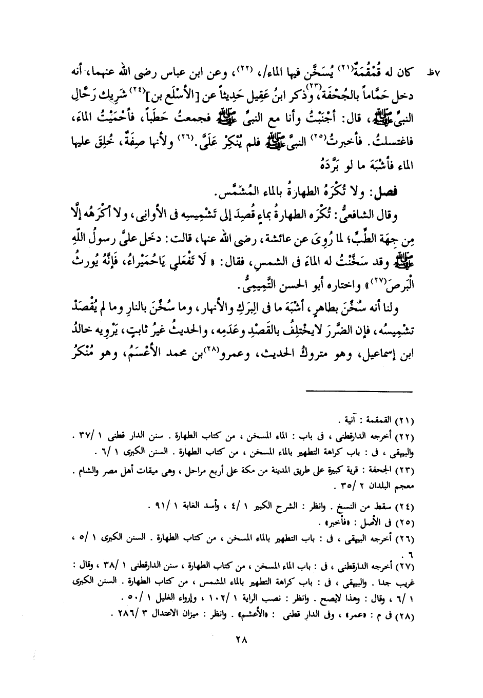 (٢٢) أخرجه الدارقطني، في باب: الماء المسخن، من كتاب الطهارة. سنن الدارقطني ١/ ٣٧. والبيهقي، في: باب كراهة التطهير بالماء المسخن، من كتاب الطهارة. السنن الكبرى ١/ ٦.