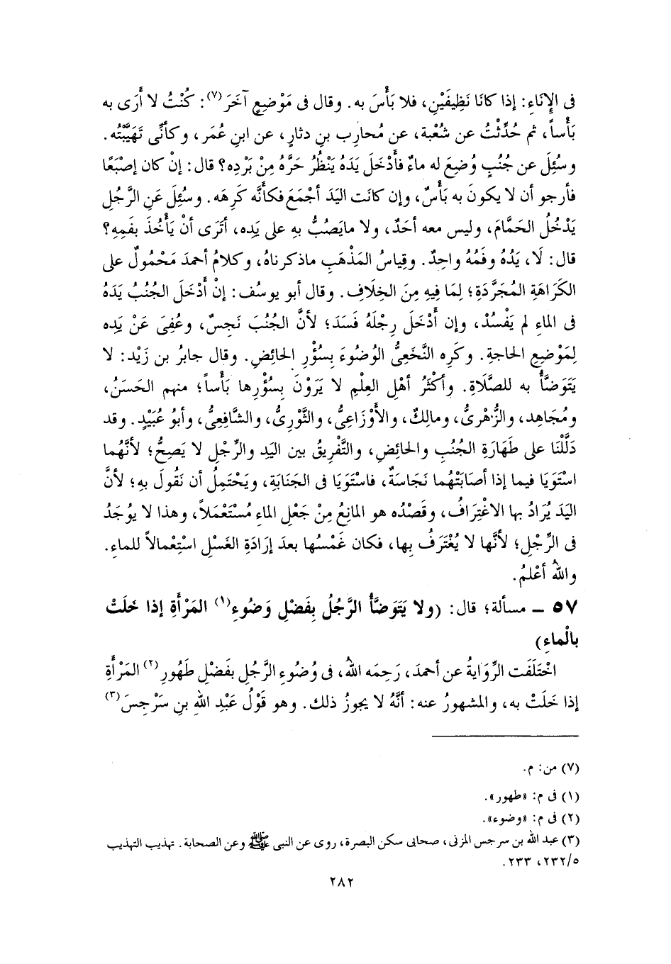 اخْتَلَفَت الرِّوَايةُ عن أحمدَ، رَحِمَه اللهُ، في وُضُوءِ الرَّجُلِ بفَضْلِ طَهُورِ (٢) المَرْأَةِ إذا خَلَتْ به، والمشهورُ عنه: أنَّهُ لا يجوزُ ذلك. وهو قَوْلُ عَبْدِ اللهِ بنِ سَرْجِسَ (٣)