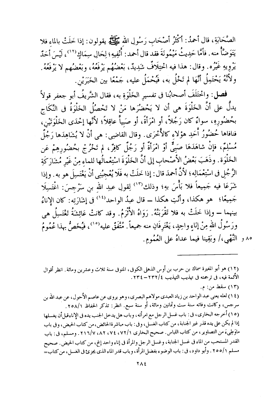 فصل: واخْتَلَفَ أصحابُنا في تفسيرِ الخَلْوَةِ به، فقال الشَّريفُ أبو جعفر قولًا يدلُّ على أنَّ الخَلْوَةَ هي أن لا يَحْضُرَها مَن لا تَحْصُلُ الخَلْوَةُ في النِّكَاحِ بحُضُورِهِ، سواءٌ كان رَجُلًا، أو امْرَأةً، أو صبِيًّا عاقِلًا؛ لأنَّها إحْدَى الخَلْوَتَيْنِ، فنافاها حُضُورُ أَحَدِ هؤلاءِ كالأُخْرَى. وقال القاضِى: هي أنْ لا يُشَاهِدَها رَجُلٌ مُسْلِمٌ، فإنْ شاهَدَهَا صَبِىٌّ أوْ امْرَأةٌ أو رَجُلٌ كافِرٌ، لم تَخْرُجْ بحُضُورِهِمْ عَن الخَلْوَة. وذَهَبَ بَعْضُ الأصْحابِ إلى أنَّ الخَلْوَةَ اسْتِعْمالُها للماءِ مِنْ غَيْرِ مُشَارَكَةِ الرَّجُلِ في اسْتِعْمَالِه؛ لأنَّ أحمدَ قال: إذا خَلَتْ به فَلَا يُعْجِبُنِى أنْ يَغْتَسِل هو به. وإذا شَرَعَا فيه جَمِيعًا فلا بَأْسَ بهِ؛ وذلك (١٣) لِقولِ عبدِ اللهِ بنِ سَرْجِسَ: اغْتَسِلَا جَمِيعًا؛ هو هكذا، وأنْتِ هكذا - قال عبدُ الواحد (١٤) في إشَارَتِه: كان الإِناءُ بينهما - وإذا خَلَتْ به فلا تَقْرَبَنَّهُ. رَوَاهُ الأَثْرَمُ. وقد كانتْ عَائِشَةُ تَغْتَسِلُ هي ورَسُولُ اللهِ مِنْ إنَاءٍ واحِدٍ، يَغْتَرِفَانِ منه جميعًا. مُتَّفَقٌ عليه (١٥)، فيُخَصُّ بهذا عُمُومُ النَّهْىِ، وبَقِينا فيما عداهُ على العُمُومِ.