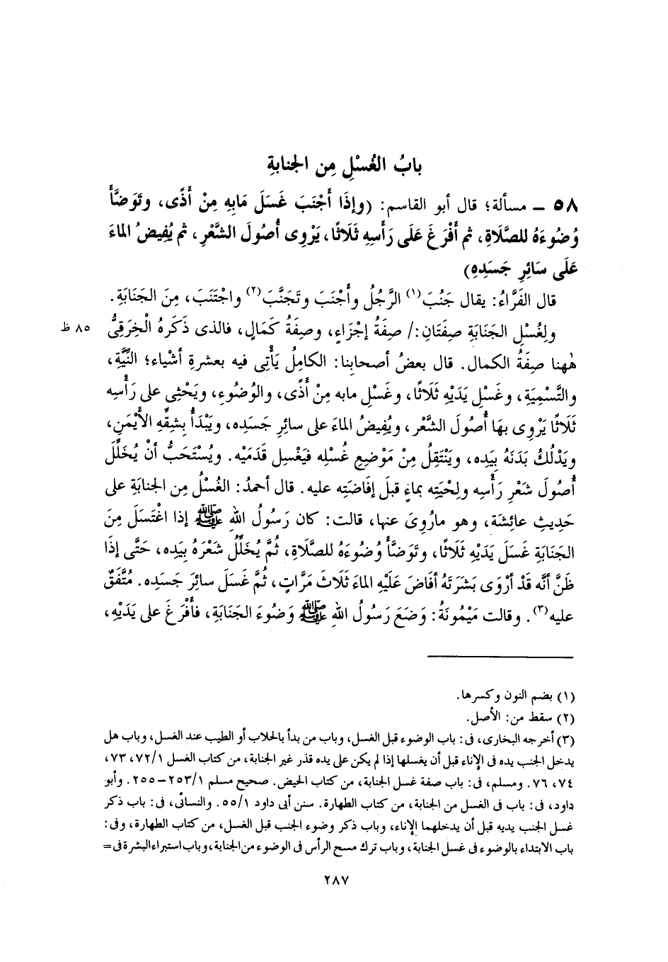 ٥٨ - مسألة؛ قال أبو القاسم: (وإذَا أَجْنَبَ غَسَلَ مَا بِهِ مِنْ أَذًى، وتَوَضَّأَ وُضُوءَهُ للصَّلَاةِ، ثم أَفْرَغَ عَلَى رَأسِهِ ثَلَاثًا، يَرْوِى أُصُولَ الشَّعْرِ، ثم يُفيضُ الماءَ عَلَى سائِرِ جَسَدِهِ)