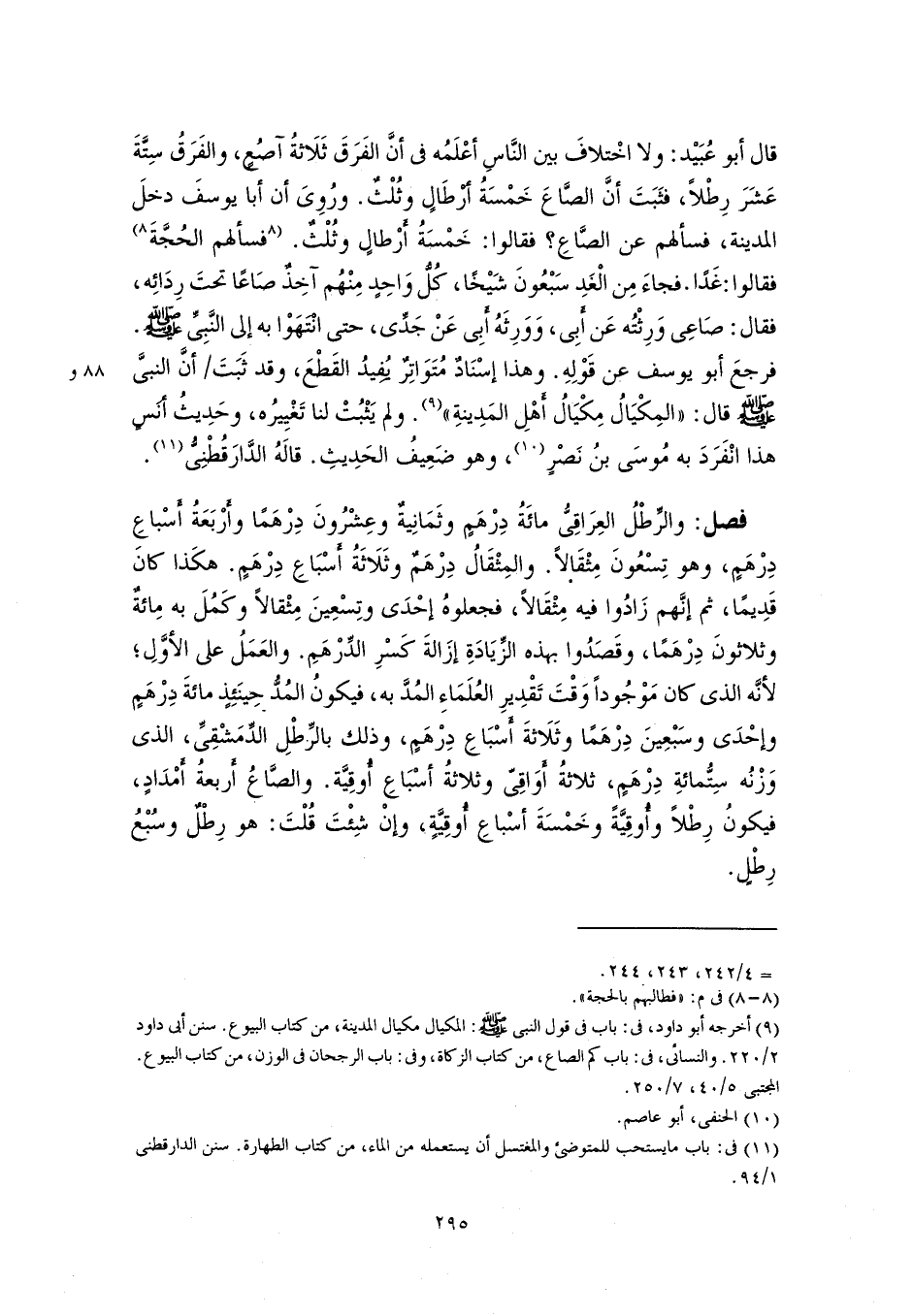 قال أبو عُبَيْد: ولا اخْتلافَ بين النَّاسِ أعْلَمُه في أنَّ الفَرَقَ ثَلَاثةُ آصُعٍ، والفَرَقُ سِتَّةَ عَشَرَ رِطْلًا، فثَبَتَ أنَّ الصَّاعَ خَمْسَةُ أرْطَالٍ وثُلْثٌ. ورُوِىَ أن أبا يوسفَ دخلَ المدينة، فسألهم عن الصَّاعِ؟ فقالوا: خَمْسَةُ أَرْطالٍ وثُلْثٌ. [فسألهم الحُجَّةَ] (٨) فقالوا: غَدًا. فجاءَ مِن الْغَدِ سَبْعُونَ شَيْخًا، كُلُّ وَاحِدٍ مِنْهُم آخِذٌ صَاعًا تحتَ رِدَائِه، فقال: صَاعِى وَرِثْتُه عَن أَبِي، وَوَرِثَهُ أَبِى عَنْ جَدِّى، حتى انْتَهَوْا به إلى النَّبِيِّ -صلى اللَّه عليه وسلم-. فرجعَ أبو يوسف عن قَوْلِهِ. وهذا إسْنَادٌ مُتَوَاتِرٌ يُفِيدُ القَطْعَ، وقد ثَبَتَ أنَّ النبيَّ -صلى اللَّه عليه وسلم- قال: "المِكْيَالُ مِكْيَالُ أَهْلِ المَدِينةِ" (٩). ولم يَثْبُتْ لنا تَغْيِيرُه، وحَدِيثُ أنَسٍ هذا انْفَرَدَ به مُوسَى بنُ نَصْرٍ (١٠)، وهو ضَعِيفُ الحَدِيثِ. قالَهُ الدَّارَقُطْنِيُّ (١١).