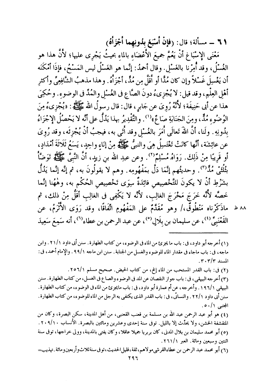 (١) أخرجه أبو داود، في: باب ما يجزئ من الماء في الوضوء، من كتاب الطهارة. سنن أبي داود ١/ ٢١. وابن ماجه، في: باب ما جاء في مقدار الماء للوضوء والغسل من الجنابة. سنن ابن ماجه ١/ ٩٩. والإِمام أحمد، في: المسند ٣/ ٣٠٣.
