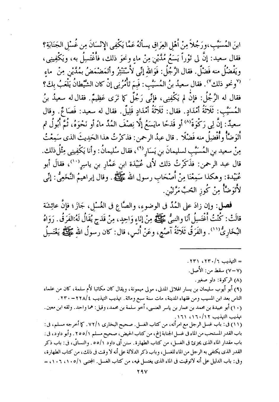 ابنَ المُسَيَّبِ، ورَجُلًا مِنْ أَهْلِ العِرَاقِ يسألهُ عَمَّا يَكْفِى الإِنْسَانَ مِن غُسْلِ الجَنَابَةِ؟ فقال سعيد: إنَّ لي تَوْرًا يَسَعُ مُدَّيْن مِنْ ماءٍ ونحوَ ذلك، فأَغْتَسِلُ به، ويَكْفِينِي، ويَفْضُلُ منه فَضْلٌ. فقال الرَّجُلُ: فَوَاللهِ إنِّي لأَسْتَنْثِرُ وأتَمَضْمَضُ بمُدَّيْنِ مِنْ ماءٍ [ونحو ذلك] (٧). فقال سعيدُ بنُ المُسَيَّبِ: فبِمَ تَأْمُرُنِي إنْ كان الشَّيْطانُ يَلْعَبُ بِكَ؟ فقال له الرَّجُلُ: فإنْ لم يَكْفِنِي، فإنِّي رَجُلٌ كما تَرَى عَظِيمٌ. فقال له سعيدُ بنُ المُسَيَّبِ: ثَلَاثَةُ أمْدَادٍ. فقال: ثَلَاثَةُ أمْدَادٍ قَلِيلٌ. فقال له سعيد: فَصَاعٌ. وقال سعيدٌ: إنَّ لِي رَكْوَةً (٨) أو قَدَحًا ما يَسَعُ إلَّا نِصْفَ المُدِّ ماءً أو نَحْوَهُ، ثُمَّ أَبُولُ ثم أَتَوَضَّأُ وأُفْضِلُ منه فَضْلًا. قال عبدُ الرحمن: فذكرْتُ هذا الحَدِيثَ الذي سَمِعْتُ مِنْ سعيد بنِ المُسَيَّبِ لسليمانَ بنِ يَسَارٍ (٩)، فقال سُليمانُ: وأنا يَكْفِينِي مِثْلُ ذلك. قال عبد الرحمن: فذَكَرْتُ ذلك لأبي عُبَيْدَة ابنِ عَمَّارِ بنِ ياسِرٍ (١٠)، فقالَ أبو عُبَيْدة: وهكذا سَمِعْنَا مِنْ أَصْحَابِ رسولِ اللَّه -صلى اللَّه عليه وسلم-. وقال إبراهيمُ النَّخَعِيُّ: إنِّي لأَتَوَضَّأُ مِنْ كُوزِ الحبِّ مَرَّتَيْنِ.