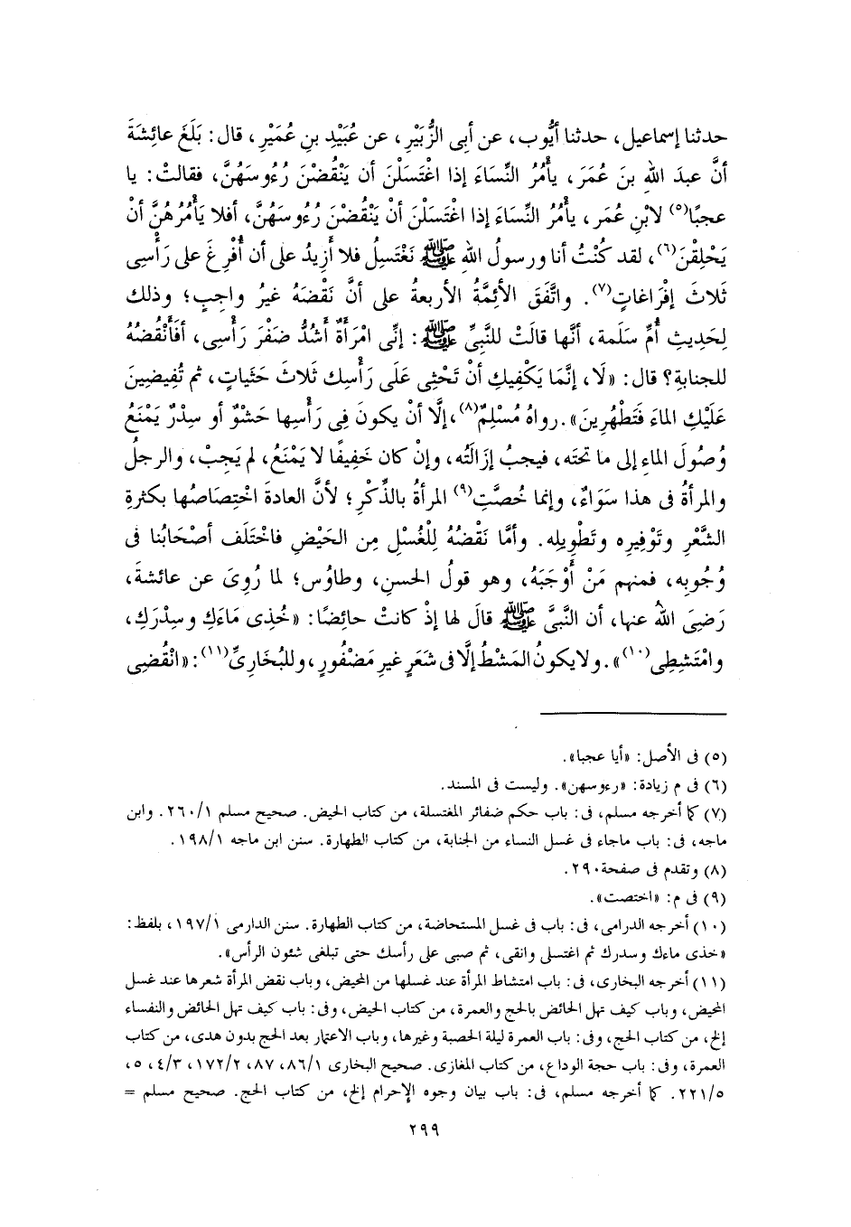 حدثنا إسماعيل، حدثنا أيُّوب، عن أبِي الزُّبَيْرِ، عن عُبَيْدِ بنِ عُمَيْرِ، قال: بَلَغَ عائِشَةَ أنَّ عبدَ اللهِ بنَ عُمَرَ، يأْمُرُ النِّسَاءَ إذا اغْتَسَلْنَ أن يَنْقُضْنَ رُءُوسَهُنَّ، فقالتْ: يا عجبًا (٥) لابْنِ عُمَر، يأْمُرُ النِّسَاءَ إذا اغْتَسَلْنَ أنْ يَنْقُضْنَ رُءُوسَهُنَّ، أفلا يَأْمُرُهُنَّ أنْ يَحْلِقْنَ (٦)، لقد كُنْتُ أنا ورسولُ اللهِ -صلى اللَّه عليه وسلم- نَغْتَسِلُ فلا أَزِيدُ على أن أُفْرِغَ على رَأْسِي ثَلاثَ إفْرَاغاتٍ (٧). واتَّفَقَ الأئِمَّةُ الأربعةُ على أنَّ نَقْضَهُ غيرُ واجِبٍ؛ وذلك لِحَدِيثِ أُمِّ سَلَمة، أنَّها قالَتْ للنَّبِيِّ -صلى اللَّه عليه وسلم-: إنِّي امْرَأةٌ أشُدُّ ضَفْرَ رَأْسِي، أفَأَنْقُضُهُ للجنابةِ؟ قال: "لَا، إنَّمَا يَكْفِيكِ أنْ تَحْثِى عَلَى رَأْسِك ثَلاثَ حَثَياتٍ، ثم تُفِيضِينَ عَلَيْكِ الماءَ فَتَطْهُرِينَ". رواهُ مُسْلِمٌ (٨)، إلَّا أنْ يكونَ في رَأْسِها حَشْوٌ أو سِدْرٌ يَمْنَعُ وُصُولَ الماءِ إلى ما تحتَه، فيجبُ إزَالَتُه، وإنْ كان خَفِيفًا لا يَمْنَعُ، لم يَجِبْ، والرجلُ والمرأةُ في هذا سَوَاءٌ، وإنما خُصَّتِ (٩) المرأةُ بالذِّكْرِ؛ لأنَّ العادةَ اخْتِصَاصُها بكثرةِ الشَّعْرِ وتَوْفِيرِه وتَطْوِيلِه. وأمَّا نَقْضُهُ لِلْغُسْلِ مِن الحَيْضِ فاخْتَلَف أصْحَابُنا في وُجُوبِه، فمنهم مَنْ أَوْجَبَهُ، وهو قولُ الحسنِ، وطاوُس؛ لما رُوِيَ عن عائشةَ، رَضِيَ اللهُ عنها، أن النَّبيَّ -صلى اللَّه عليه وسلم- قالَ لها إذْ كانتْ حائِضًا: "خُذِى مَاءَكِ وسِدْرَكِ، وامْتَشِطِى (١٠) ". ولا يكونُ المَشْطُ إلَّا في شَعَرٍ غيرِ مَضْفُورٍ، وللبُخَارِيِّ (١١): "انْقُضِى