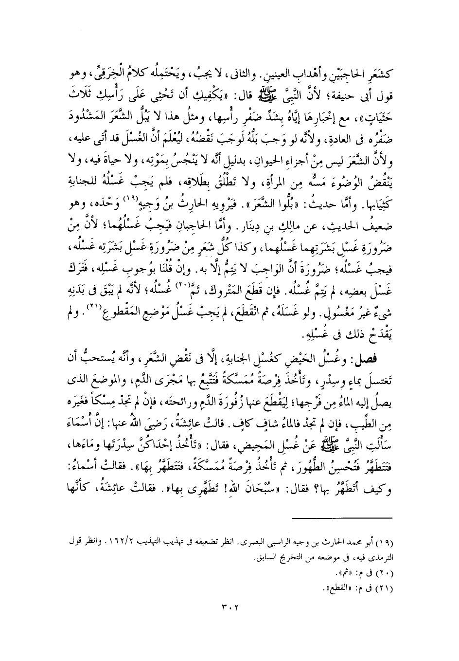فصل: وغُسْلُ الحَيْضِ كغُسْلِ الجنابةِ، إلَّا في نَقْضِ الشَّعَرِ، وأنَّه يُستحبُّ أن تَغتسلَ بماءٍ وسِدْرٍ، وتَأْخُذَ فِرْصَةً مُمَسَّكةً فَتَتَّبِعُ بها مَجْرَى الدَّمِ، والموضعَ الذي يصلُ إليه الماءُ مِن فَرْجِها؛ لِيَقْطَعَ عنها زُفُورَةَ الدَّمِ ورائحتَه، فإنْ لم تجدْ مِسْكًا فغَيرَه مِن الطِّيبِ، فإن لم تجدْ فالماءُ شافٍ كافٍ. قالتْ عائِشَةُ، رَضِىَ اللهُ عنها: إنَّ أَسْمَاءَ سَأَلَتِ النَّبِيَّ -صلى اللَّه عليه وسلم- عَنْ غُسْلِ المَحِيضِ، فقال: "تَأْخُذُ إحْدَاكُنَّ سِدْرَتَها ومَاءَها، فتَتَطَهَّرُ فَتُحْسِنُ الطُّهُورَ، ثم تَأْخُذُ فِرْصَةً مُمَسَّكَةً، فتَتَطَهَّرُ بِهَا". فقالتْ أسْماءُ: وكيف أتَطَهَّرُ بها؟ فقال: "سُبْحَانَ اللهِ! تَطهَّرِي بِها". فقالتْ عائِشَةُ، كأنَّها