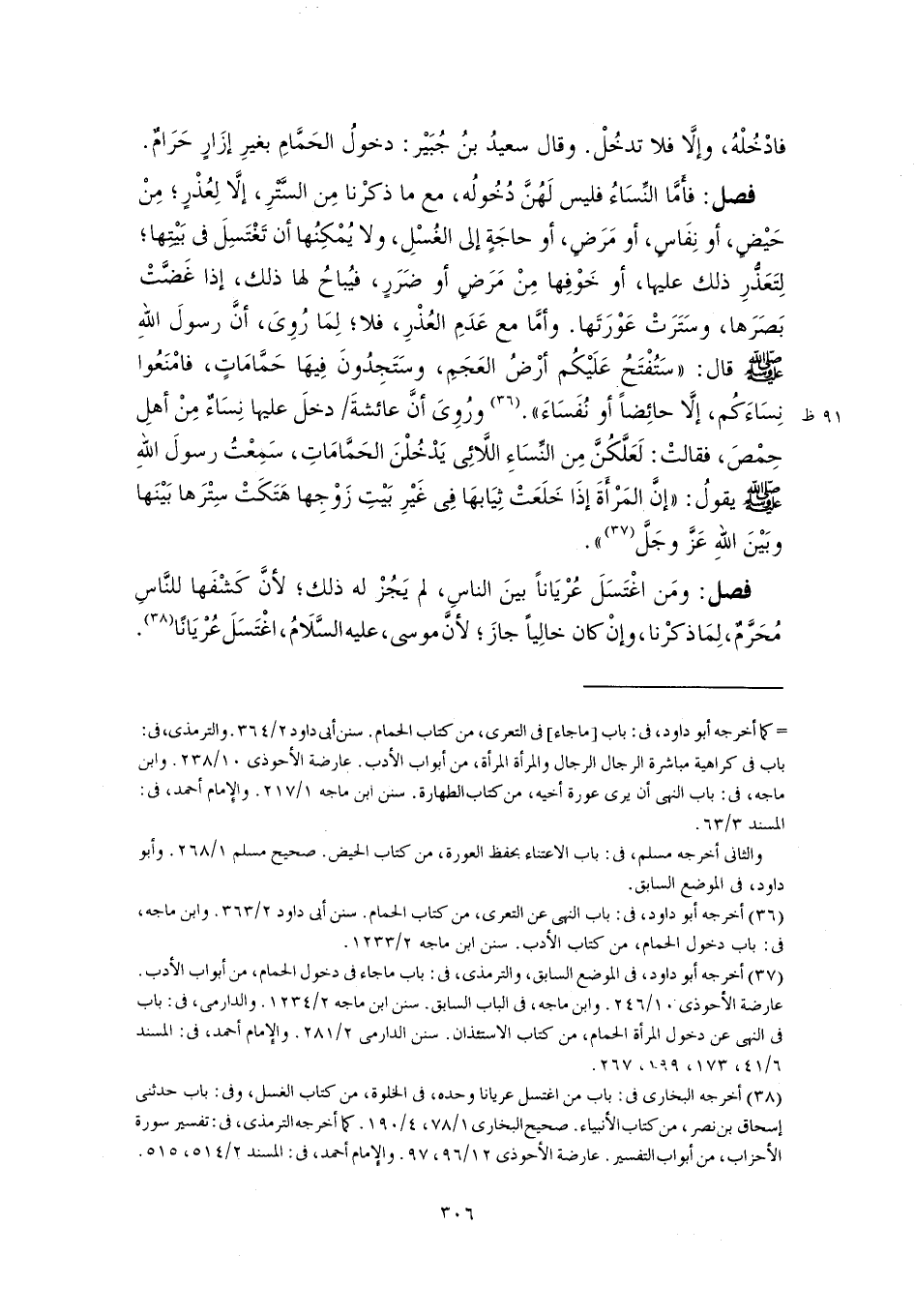 (٣٧) أخرجه أبو داود، في الموضع السابق، والترمذي، في: باب ما جاء في دخول الحمام، من أبواب الأدب. عارضة الأحوذى ١٠/ ٢٤٦. وابن ماجه، في الباب السابق. سنن ابن ماجه ٢/ ١٢٣٤. والدارمى، في: باب في النهى عن دخول المرأة الحمام، من كتاب الاستئذان. سنن الدارمي ٢/ ٢٨١. والإِمام أحمد، في: المسند ٦/ ٤١، ١٧٣، ١٩٩، ٢٦٧.