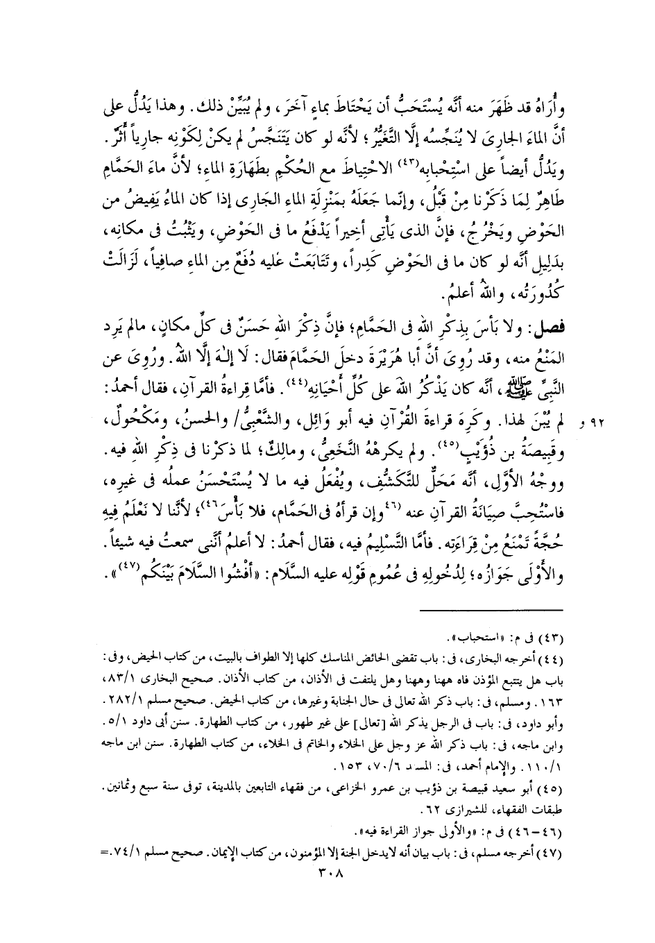 فصل: ولا بَأسَ بِذِكْرِ اللهِ في الحَمَّامِ؛ فإنَّ ذِكْرَ اللهِ حَسَنٌ في كلِّ مكانٍ، ما لم يَرِد المَنْعُ منه، وقد رُوِىَ أنَّ أَبا هُرَيْرَةَ دخلَ الحَمَّامَ فقال: لَا إلهَ إلَّا اللهُ. ورُوِىَ عن النَّبِيِّ -صلى اللَّه عليه وسلم-، أنَّه كان يَذْكُرُ اللهَ على كُلِّ أَحْيَانِهِ (٤٤). فأمَّا قِراءةُ القرآنِ، فقال أحمدُ: لم يُبْنَ لهذا. وكَرِهَ قراءةَ القُرْآنِ فيه أبو وَائِل، والشَّعْبِىُّ والحسنُ، ومَكْحُولٌ، وقَبِيصَةُ بن ذُؤَيْبٍ (٤٥). ولم يكرهْهُ النَّخَعِىُّ، ومالِكٌ؛ لما ذكرْنا في ذِكْرِ اللهِ فيه. ووجْهُ الأوَّلِ، أنَّه مَحَلٌّ للتَّكَشُّفِ، ويُفْعَلُ فيه ما لا يُسْتَحْسَنُ عملُه في غيرِه، فاسْتُحِبَّ صِيَانَةُ القرآنِ عنه [وإن قرأهُ في الحَمَّام، فلا بَأْسَ] (٤٦)؛ لأنَّنا لا نَعْلَمُ فِيهِ حُجَّةً تَمْنَعُ مِنْ قِرَاءَتِه. فأمَّا التَّسْلِيمُ فيه، فقال أحمدُ: لا أعلمُ أنَّنى سمعتُ فيه شيئًا. والأَوْلَى جَوَازُه؛ لِدُخُولِهِ في عُمُومِ قَوْلِه عليه السَّلَام: "أفْشُوا السَّلَامَ بَيْنَكُم (٤٧) ".