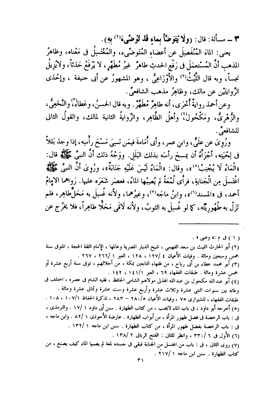 يعني: الماءَ المُنْفَصِلَ عن أعضاءِ المُتَوضِّىء، والمُغْتَسِلُ في مَعْناه، وظاهرُ المذهبِ أنَّ المُسْتعمَلَ في رَفْعِ الحدثِ طاهرٌ غيرُ مُطَهِّرٍ، لا يَرْفَعُ حَدَثًا، ولا يُزِيلُ نجسًا، وبه قال اللَّيْثُ (٢) والأوْزَاعِىُّ، وهو المشهورُ عن أبي حنيفة، وإحْدَى الرِّوايتَيْن عن مالك، وظاهِرُ مذهب الشافعيِّ.