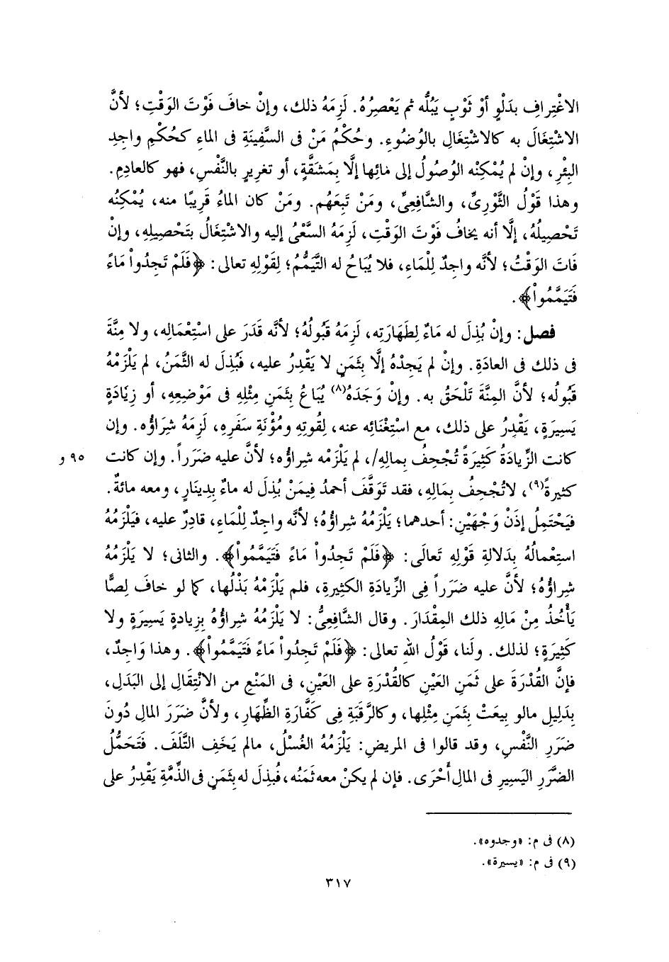 فصل: وإنْ بُذِلَ له مَاءٌ لِطهَارَتِه، لَزِمَهُ قَبُولُهُ؛ لأنَّه قَدَرَ على اسْتِعْمَالِه، ولا مِنَّةَ في ذلك في العادَةِ. وإنْ لم يَجِدْهُ إلَّا بِثَمَنٍ لا يَقْدِرُ عليه، فَبُذِلَ له الثَّمَنُ، لم يَلْزَمْهُ قَبُولُه؛ لأنَّ المِنَّةَ تَلْحَقُ به. وإنْ وَجَدَهُ (٨) يُبَاعُ بِثَمَنِ مِثْلِهِ في مَوْضِعِهِ، أو زِيَادَةٍ يَسِيرَةٍ، يَقْدِرُ على ذلك، مع اسْتِغْنَائِه عنه، لِقُوتِهِ ومُؤْنَةِ سَفَرِهِ، لَزِمَهُ شِرَاؤُه. وإن كانت الزِّيادَةُ كَثِيرَةً تُجْحِفُ بِمالِهِ، لم يَلْزَمْه شِراؤُه؛ لأنَّ عليه ضَرَرًا. وإن كانت كثيرةً (٩)، لا تُجْحِفُ بِمَالِهِ، فقد تَوَقَّفَ أحمدُ فِيمَنْ بُذِلَ له ماءٌ بِدِينَارٍ، معه مائةٌ. فيَحْتَمِلُ إذَنْ وَجْهَيْنِ: أحدهما؛ يَلْزَمُهُ شِراؤُهُ؛ لأنَّه واجِدٌ لِلْمَاءِ، قادِرٌ عليه، فيَلْزَمُهُ استِعْمالُهُ بِدَلالةِ قَوْلِهِ تَعالَى: {فَلَمْ تَجِدُوا مَاءً فَتَيَمَّمُوا}. والثانى؛ لا يَلْزَمُهُ شِراؤُهُ؛ لأنَّ عليه ضَرَرًا في الزِّيادَةِ الكثِيرةِ، فلم يَلْزَمْهُ بَذْلُها، كما لو خافَ لِصًّا يَأْخُذُ مِنْ مَالِهِ ذلك المِقْدَارَ. وقال الشَّافِعِىُّ: لا يَلْزَمُهُ شِراؤُهُ بِزِيادةٍ يَسِيرَةٍ ولا كَثِيرَةٍ؛ لذلك. ولَنا، قَوْلُ اللهِ تعالى: {فَلَمْ تَجِدُوا مَاءً فَتَيَمَّمُوا}. وهذا وَاجِدٌ، فإنَّ القُدْرَةَ على ثَمَنِ العَيْنِ كالقُدْرَةِ على العَيْنِ، في المَنْعِ من الانْتِقَالِ إلى البَدَلِ، بِدَلِيلِ ما لو بِيعَتْ بِثَمَنِ مِثْلِها، وكالرَّقَبَةِ في كَفَّارَةِ الظِّهَارِ، ولأنَّ ضَرَرَ المالِ دُونَ ضَرَرِ النَّفْسِ، وقد قالوا في المريضِ: يَلْزَمُهُ الغُسْلُ، ما لم يَخَفِ التَّلَفَ. فَتَحَمُّلُ الضَّرَرِ اليَسِيرِ في المالِ أَحْرَى. فإن لم يكنْ معه ثَمَنُه، فُبذِلَ له بِثَمَنٍ في الذِّمَّةِ يَقْدِرُ على