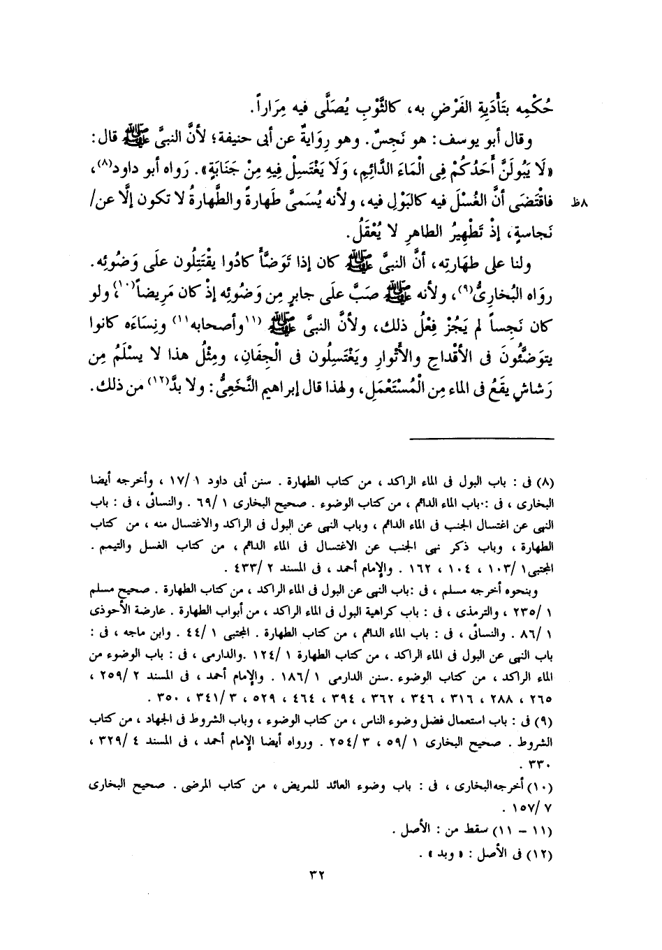 (٨) في: باب البول في الماء الراكد، من كتاب الطهارة. سنن أبي داود ١/ ١٧، وأخرجه أيضًا البخاري، في: باب الماء الدائم، من كتاب الوضوء. صحيح البخاري ١/ ٦٩. والنسائي، في: باب النهى عن الاغتسال الجنب في الماء الدائم، وباب النهى عن البول في الراكد والاغتسال منه، من كتاب الطهارة، وباب ذكر نهى الجنب عن الاغتسال في الماء الدائم، من كتاب الغسل والتيمم. المجتبى ١/ ١٠٣، ١٠٤، ١٦٢. والإمام أحمد، في المسند ٢/ ٤٣٣.
