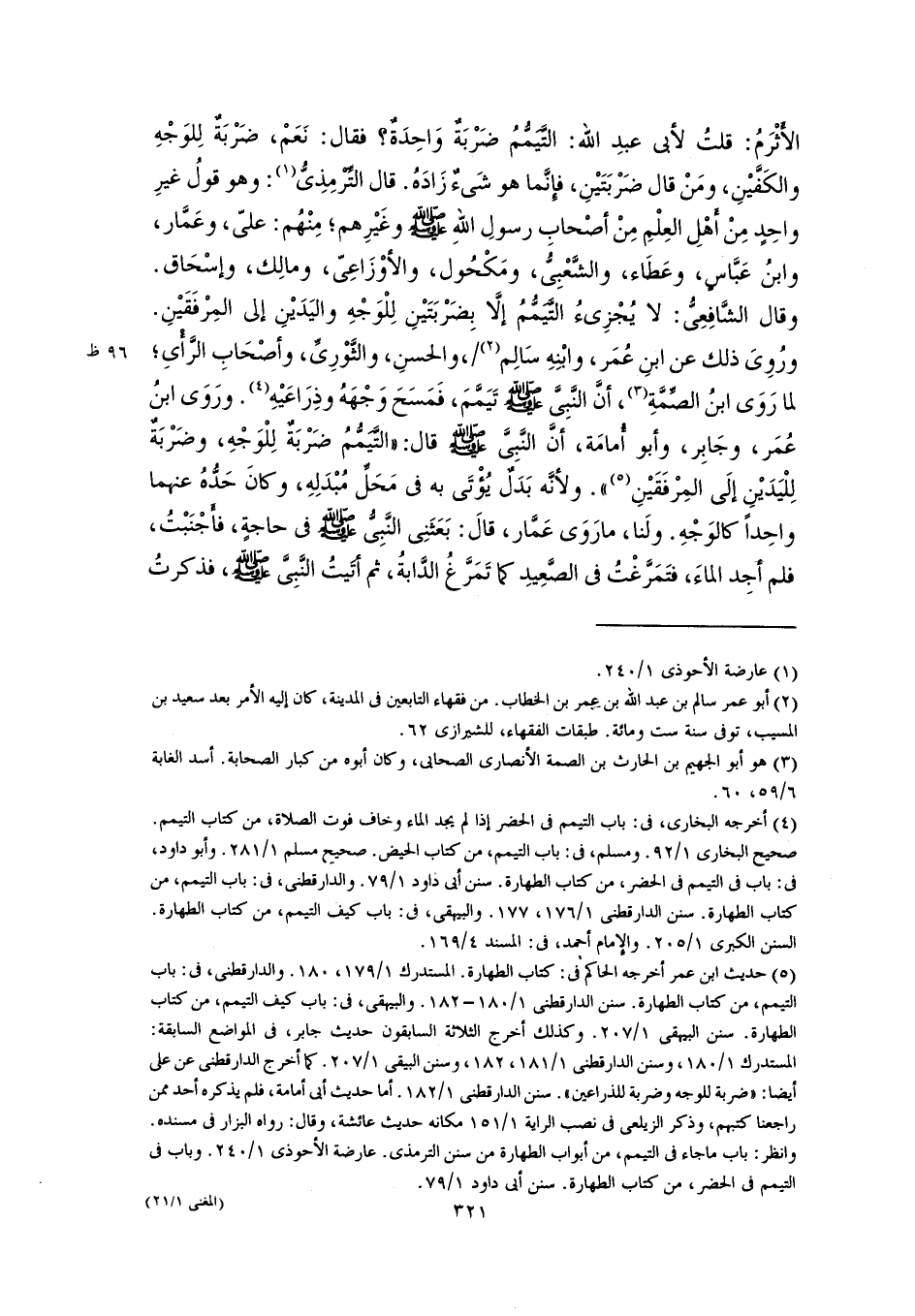 (٥) حديث ابن عمر أخرجه الحاكم في: كتاب الطهارة. المستدرك ١/ ١٧٩، ١٨٠. والدارقطني، في: باب التيمم، من كتاب الطهارة. سنن الدارقطني ١/ ١٨٠ - ١٨٢. والبيهقي، في: باب كيف التيمم، من كتاب الطهارة. سنن البيهقي ١/ ٢٠٧. وكذلك أخرج الثلاثة السابقون حديث جابر، في المواضع السابقة: المستدرك ١/ ١٨٠، وسنن الدارقطني ١/ ١٨١، ١٨٢، وسنن البيهقي ١/ ٢٠٧. كما أخرج الدارقطني عن على أيضًا: "ضربة للوجه وضربة للذراعين". سنن الدارقطني ١/ ١٨٢. أما حديث أبي أمامة، فلم يذكره أحد ممن راجعنا كتبهم، وذكر الزيلعي في نصب الراية ١/ ١٥١ مكانه حديث عائشة، وقال: رواه البزار في مسنده. وانظر: باب ما جاء في التيمم، من أبواب الطهارة من سنن الترمذي. عارضة الأحوذى ١/ ٢٤٠. وباب في التيمم في الحضر، من كتاب الطهارة. سنن أبي داود ١/ ٧٩.