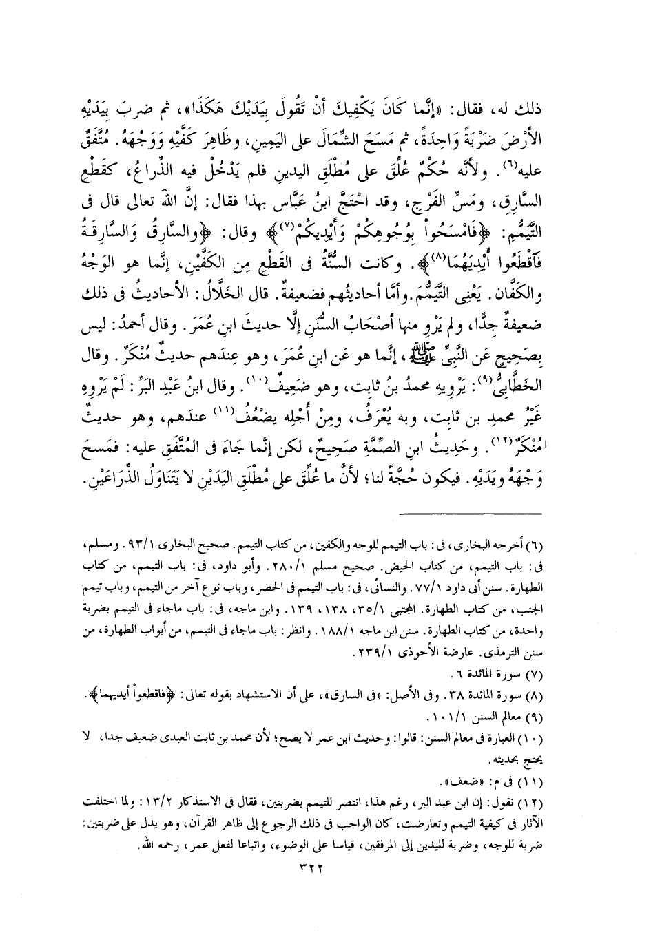 (١٢) نقول: إن ابن عبد البر، رغم هذا، انتصر للتيمم بضربتين، فقال في الاستذكار ٢/ ١٣: ولما اختلفت الآثار في كيفية التيمم وتعارضت، كان الواجب في ذلك الرجوع إلى ظاهر القرآن، وهو يدل على ضربتين: ضربة للوجه، وضربة لليدين إلى المرفقين، قياسا على الوضوء، واتباعا لفعل عمر، رحمه اللَّه.