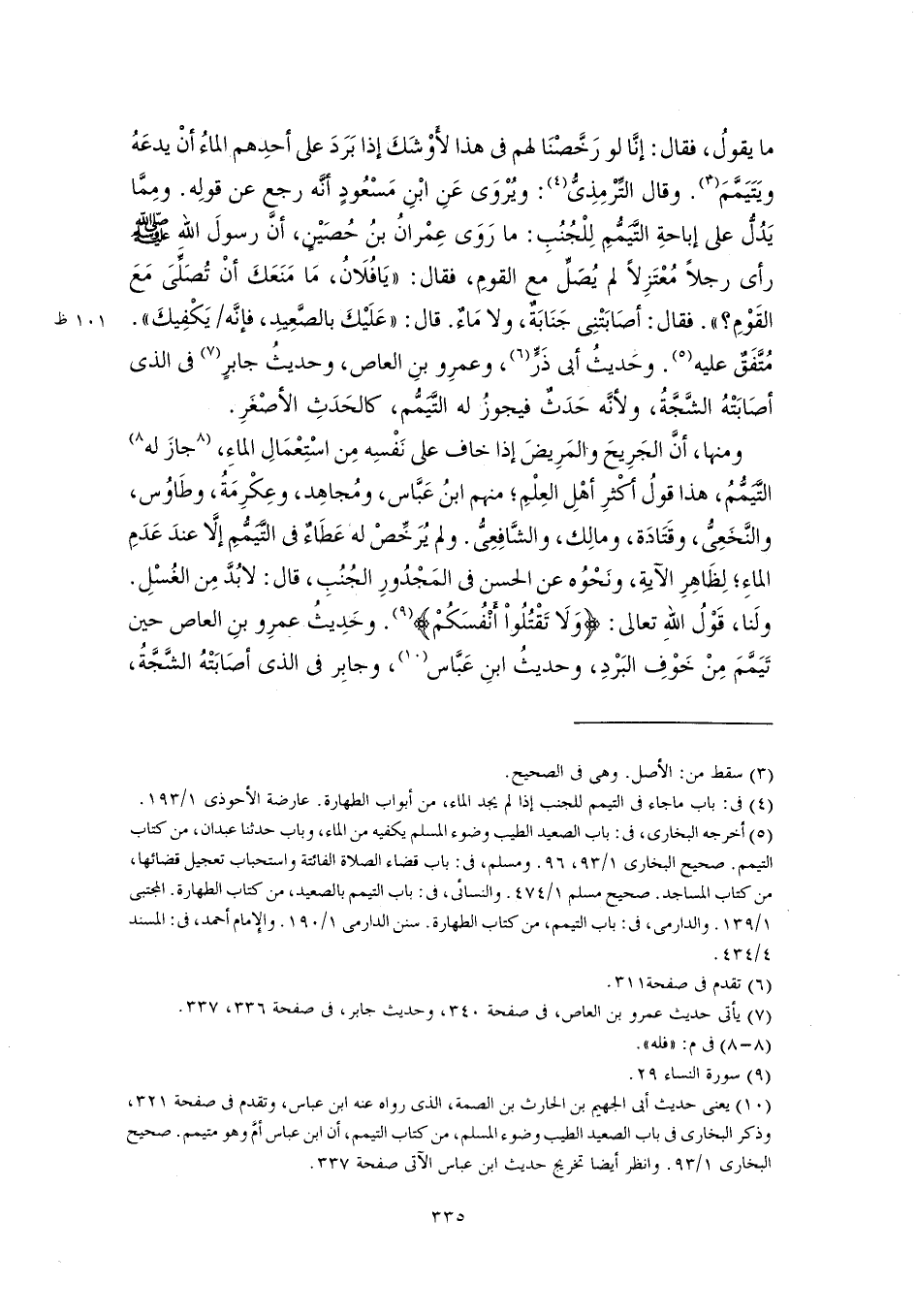 (١٠) يعني حديث أبى الجهيم بن الحارث بن الصمة، الذي رواه عنه ابن عباس، وتقدم في صفحة ٣٢١، وذكر البخاري في باب الصعيد الطيب وضوء المسلم، من كتاب التيمم، أن ابن عباس أمَّ وهو متيمم. صحيح البخاري ١/ ٩٣. وانظر أيضًا تخريج حديث ابن عباس الآتى صفحة ٣٣٧.
