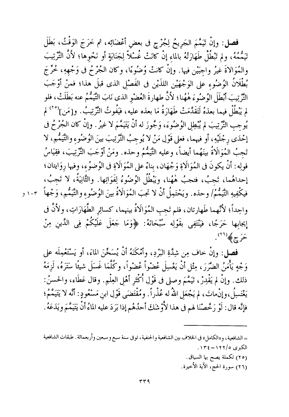 فصل: وإنْ تَيَمَّمَ الجَرِيحُ لِجُرْحٍ في بعضِ أعْضَائِه، ثم خَرَجَ الوَقْتُ، بَطَلَ تَيَمُّمُهُ، ولم تَبْطُلْ طَهَارَتُهُ بالماءِ إنْ كانَتْ غُسْلًا لِجَنَابَةٍ أو نَحْوِها؛ لأنَّ التَّرْتِيبَ والمُوَالاةَ غيرُ واجِبَيْن فيها. وإنْ كانتْ وُضُوءًا، وكان الجُرْحُ في وَجْهِهِ، خُرِّجَ بُطْلَانُ الوُضُوءِ على الوَجْهَيْن اللذَيْن في الفَصْلِ الذي قبلَ هذا؛ فمنْ أوْجَبَ التَّرْتِيبَ أبْطَلَ الوُضُوءَ ههُنا؛ لأنَّ طهارةَ العُضْوِ الذي نَابَ التَّيَمُّمُ عنه بَطَلَتْ، فلو لم يَبْطُلْ فيما بعدَهُ لَتَقَدَّمَتْ طَهَارَةُ مَا بعدَه عليه، فيَفُوتُ التَّرْتِيبُ. و [مَن] (٢٥) لم يُوجِبِ التَّرْتِيبَ لم يُبْطِلِ الوُضُوءَ، وَجَّوزَ له أنْ يَتَيَمَّمَ لا غيرُ. وإنْ كان الجُرْحُ في إحْدَى رِجْلَيْهِ، أو فيهما، فعلى قَوْلِ مَنْ لا يُوجِبُ التَّرْتِيبَ بينَ الوُضُوءِ والتَّيَمُّمِ، لا تَجِبُ المُوَالَاةُ بينَهُما أيضًا، وعليه التَّيَمُّمُ وحدَه. ومَنْ أوْجَبَ التَّرْتِيبَ، فقِيَاسُ قولِه: أنْ يكونَ في المُوَالَاةِ وَجْهَان، بِناءً على المُوَالَاةِ في الوُضوُءِ، وفيها رِوَايتان؛ إحداهُما، تَجِبُ، فتجبُ ههُنا، ويَبْطُلُ الوُضُوءُ لِفَوَاتِها. والثَّانِيَةُ، لا تَجِبُ، فيكْفِيهِ التَّيَمُّمُ وحدَه. ويَحْتَمِلُ أنْ لا تجبَ المُوَالَاةُ بينَ الوُضُوءِ والتَّيَمُّمِ، وَجْهًا واحِدًا؛ لأنَّهما طَهارتان، فلم تَجِبِ المُوَالَاةُ بينهما، كسائِرِ الطَّهَارَاتِ، ولأنَّ في إِيجابِها حَرَجًا، فيَنْتَفِى بقَوْلِه سُبْحَانَهُ: {وَمَا جَعَلَ عَلَيْكُمْ فِي الدِّينِ مِنْ حَرَجٍ} (٢٦).