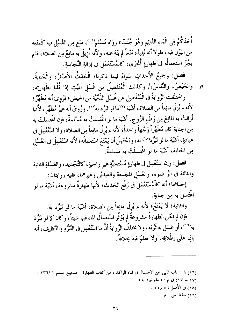 فصل: وجميعُ الأحداثِ سَواءٌ فيما ذكرنا؛ الْحَدَثُ الأصْغرُ، والْجَنابةُ، والحَيْضُ، والنِّفاسُ، وكذلك الْمُنْفَصِلُ مِن غَسْلِ الميِّتِ إذا قُلْنا بطهارتِه، واخْتلَفتِ الرِّوايةُ في الْمُنْفَصِلِ عن غُسْل الذِّمِّيَّة من الحيض؛ فرُوِىَ أنه مُطهِّرٌ؛ لأنه لم يُزِلْ مانِعًا من الصلاة، أشْبَهَ [ما لو تَبَرَّد به] (١٧). ورُوِىَ أنه غيرُ مُطَهِّرٍ، لأنها أزالتْ به المانِعَ مِن وَطْءِ الزَّوج، أشْبَهَ ما لو اغْتَسلتْ به مُسْلمةٌ، فإنَّ اغْتسلتْ به مِن الجنابةِ كان مُطَهِّرًا وَجْهًا واحدًا؛ لأنَّه لم يُزِلْ مانِعًا مِن الصلاة، ولا اسْتُعْمِلَ في عبادةٍ، أشْبَهَ ما لو تَبَرَّد (١٨) به، ويَحْتَمِلُ أن يَمْنَعَ اسْتعمالُه؛ لأنه اسْتُعْمِلَ في الغُسْلِ مِن الجنابة، أشْبَهَ ما لو اغْتسلَتْ به مسلمةٌ.
