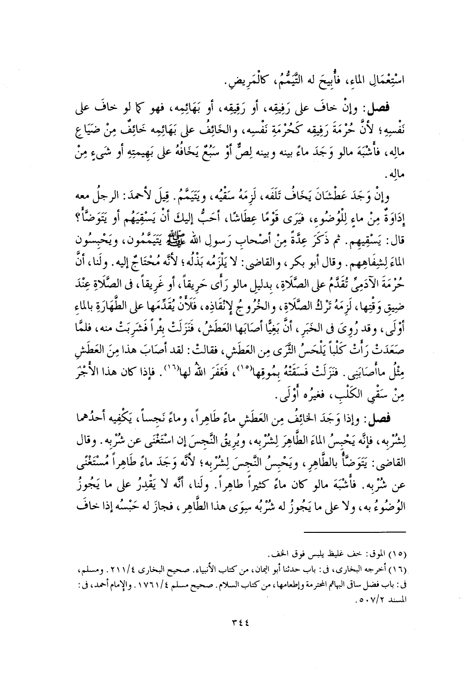فصل: وإنْ خافَ على رَفِيقِه، أو رَقِيقِه، أو بَهَائِمِه، فهو كما لو خافَ على نَفْسِهِ؛ لأنَّ حُرْمَةَ رَفِيقِه كَحُرْمَةِ نَفْسِه، والخَائِفُ على بَهَائِمِه خَائِفٌ مِنْ ضَيَاعِ مالِه، فأَشْبَهَ ما لو وَجَدَ ماءً بينه وبينه لِصٌّ أوْ سَبُعٌ يَخَافُهُ على بَهِيمتِهِ أو شَىءٍ مِنْ مالِه.